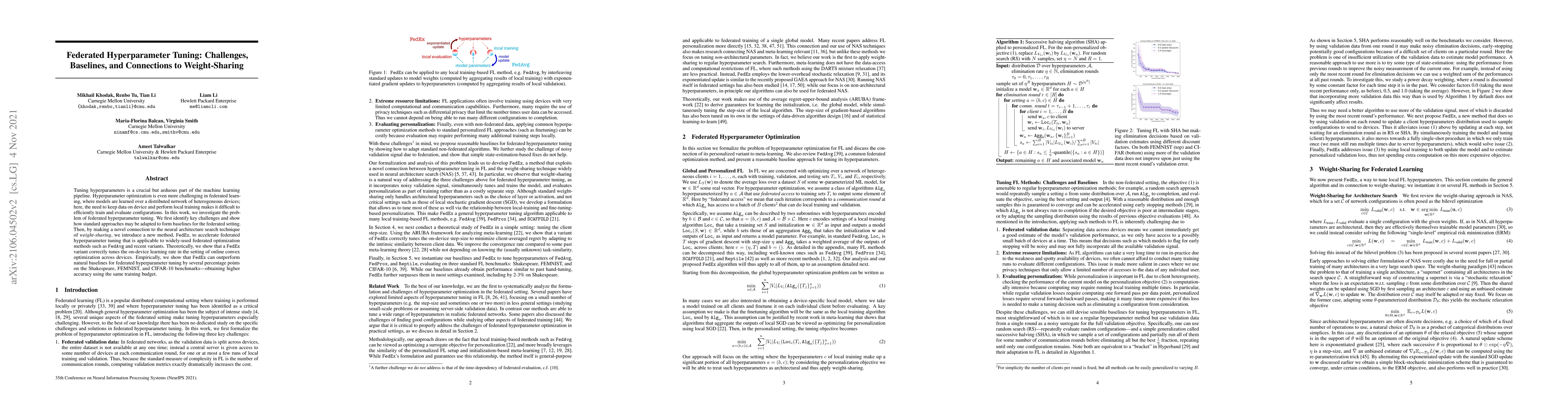 This paper explores the challenges of hyperparameter tuning in federated learning, proposing a new method, FedEx, that leverages weight-sharing to accelerate the process. It demonstrates that FedEx outperforms baselines on multiple benchmarks, achieving higher accuracy with the same training budget.