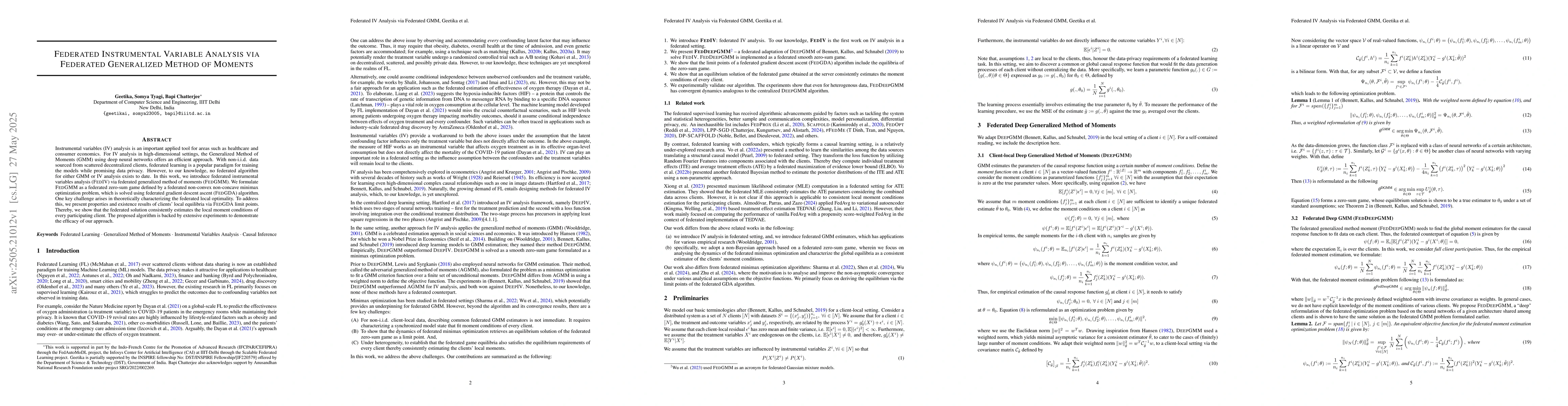 The research introduces federated instrumental variables analysis (FedIV) via federated generalized method of moments (FedGMM), formulated as a federated zero-sum game solved using federated gradient descent ascent (FedGDA). It addresses local optimality through properties and existence results of clients' local equilibria via FedGDA limit points.