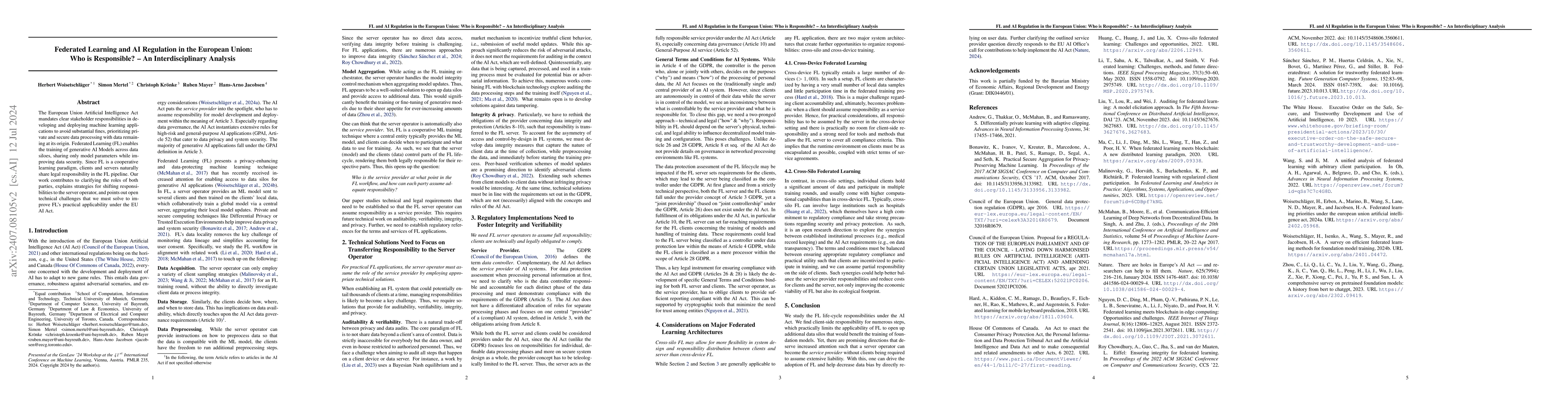 The European Union Artificial Intelligence Act mandates clear stakeholder responsibilities in developing and deploying machine learning applications to avoid substantial fines, prioritizing private and secure data processing with data remaining at its origin. Federated Learning (FL) enables the training of generative AI Models across data siloes, sharing only model parameters while improving data security. Since FL is a cooperative learning paradigm, clients and servers naturally share legal responsibility in the FL pipeline. Our work contributes to clarifying the roles of both parties, explains strategies for shifting responsibilities to the server operator, and points out open technical challenges that we must solve to improve FL's practical applicability under the EU AI Act.