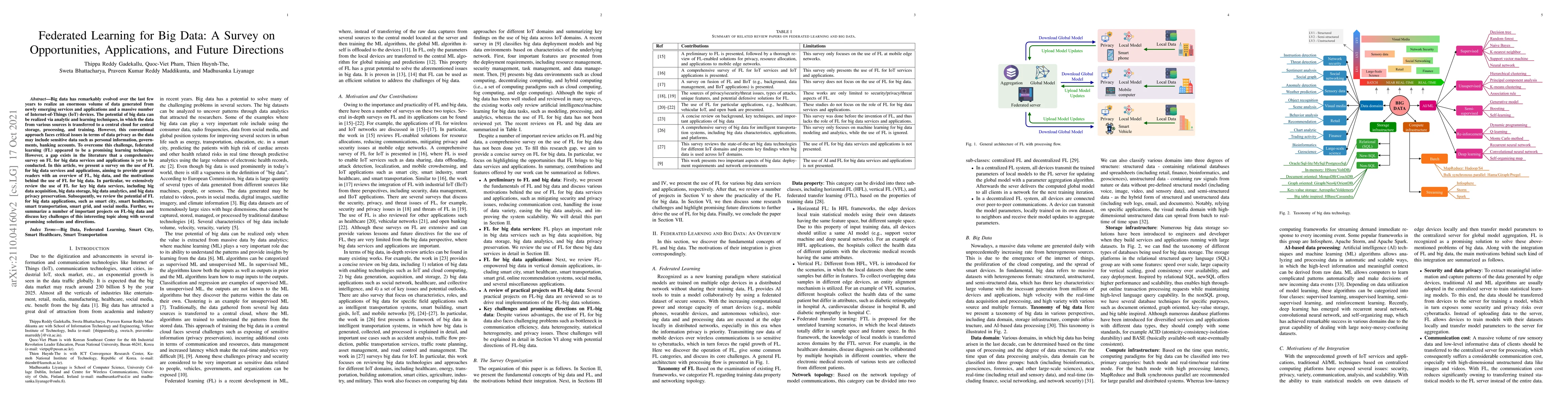 This paper surveys federated learning (FL) applications in big data, addressing privacy concerns in data aggregation and processing. It reviews FL's use in big data services and applications, including smart city and healthcare, and discusses challenges and future directions.