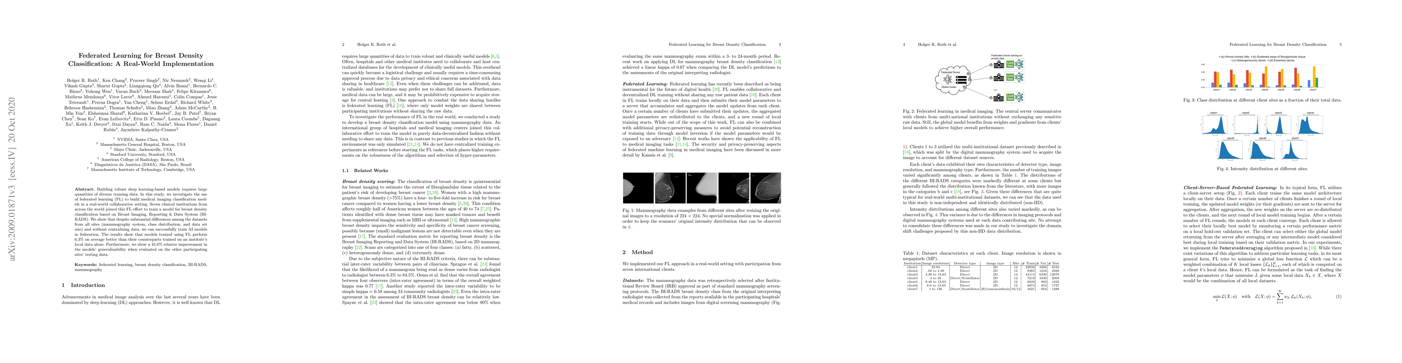 This study explores federated learning (FL) for training deep learning models to classify breast density using diverse datasets from seven global clinical institutions. The results demonstrate that FL enables effective model training without centralizing data, achieving a 6.3% better performance and a 45.8% relative improvement in generalizability compared to models trained on local data alone.