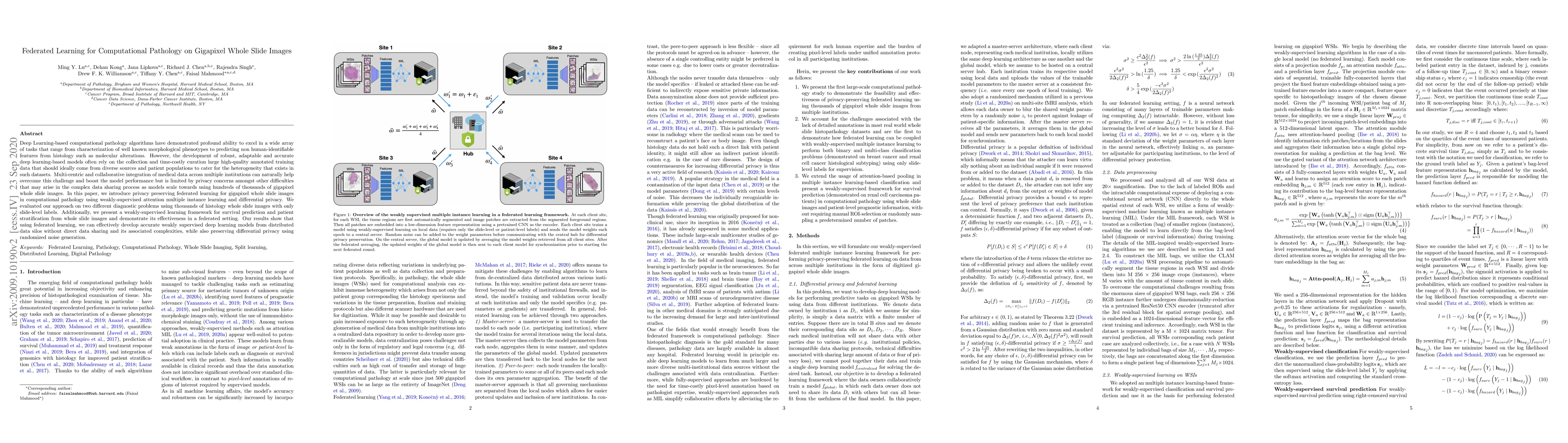 This paper proposes a federated learning approach for developing robust deep learning models in computational pathology using gigapixel whole slide images. It introduces a method that leverages weakly-supervised attention multiple instance learning and differential privacy to create accurate models without sharing sensitive patient data, demonstrating effectiveness on diagnostic tasks.