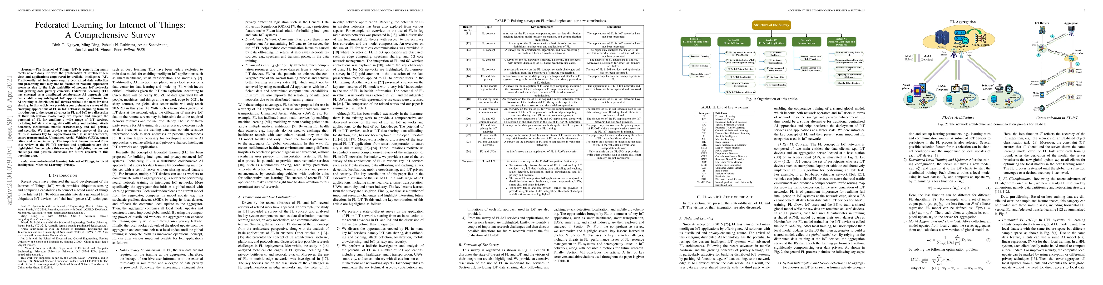 This paper provides a comprehensive survey on Federated Learning (FL) applications in IoT, highlighting its potential to address scalability and privacy issues in distributed IoT networks. It explores various FL-enabled IoT services and applications, including smart healthcare and smart cities, and discusses current challenges and future research directions.