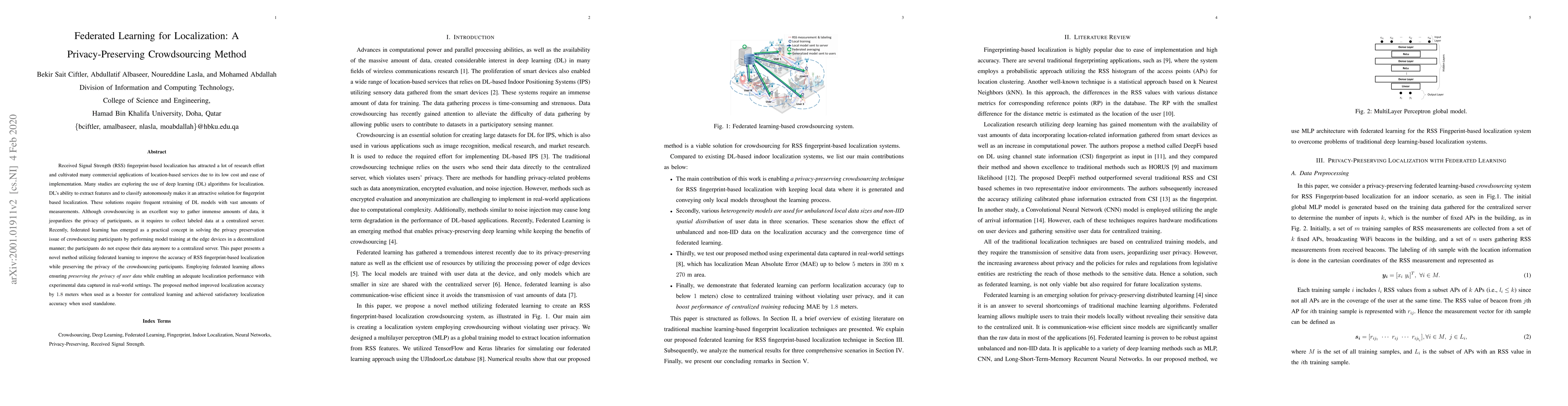 This paper proposes a federated learning approach to enhance the accuracy of Received Signal Strength (RSS) fingerprint-based localization while safeguarding the privacy of crowdsourcing participants. The method trains models at edge devices, avoiding centralized data collection, and achieves improved localization accuracy by 1.8 meters when used to augment centralized learning.