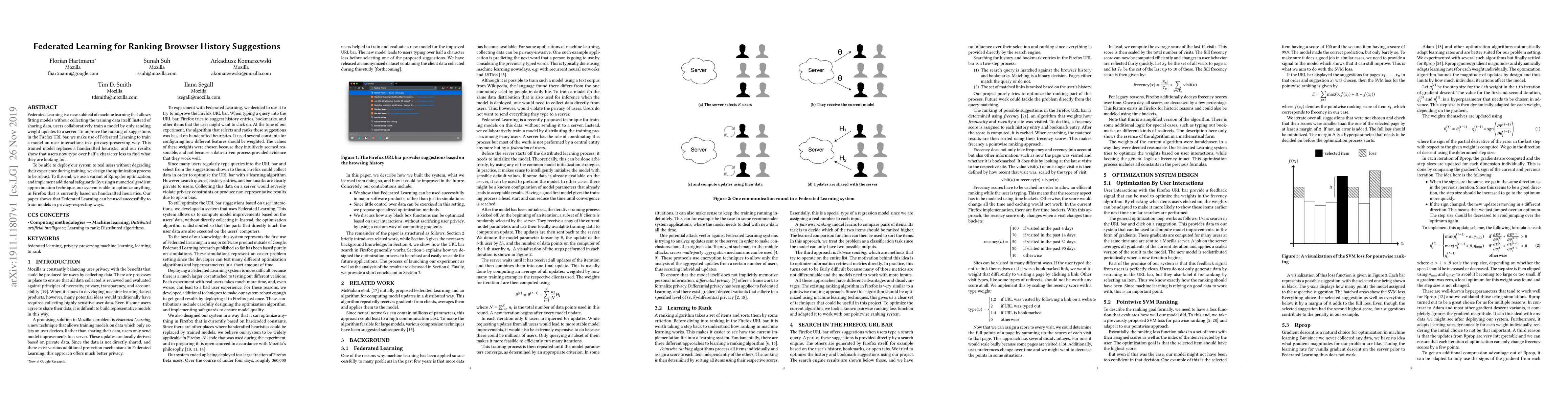 Federated Learning is a new subfield of machine learning that allows fitting models without collecting the training data itself. Instead of sharing data, users collaboratively train a model by only sending weight updates to a server. To improve the ranking of suggestions in the Firefox URL bar, we make use of Federated Learning to train a model on user interactions in a privacy-preserving way. This trained model replaces a handcrafted heuristic, and our results show that users now type over half a character less to find what they are looking for. To be able to deploy our system to real users without degrading their experience during training, we design the optimization process to be robust. To this end, we use a variant of Rprop for optimization, and implement additional safeguards. By using a numerical gradient approximation technique, our system is able to optimize anything in Firefox that is currently based on handcrafted heuristics. Our paper shows that Federated Learning can be used successfully to train models in privacy-respecting ways.