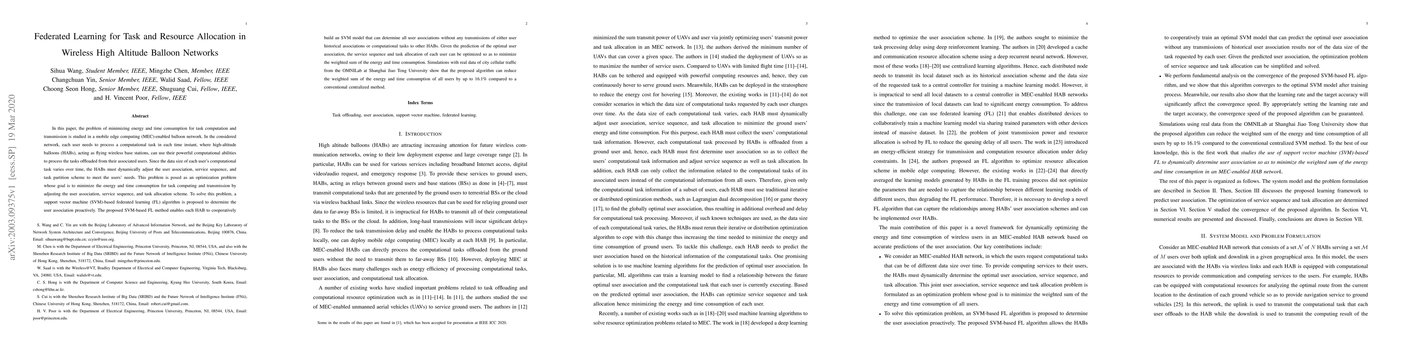 In this paper, the problem of minimizing energy and time consumption for task computation and transmission is studied in a mobile edge computing (MEC)-enabled balloon network. In the considered network, each user needs to process a computational task in each time instant, where high-altitude balloons (HABs), acting as flying wireless base stations, can use their powerful computational abilities to process the tasks offloaded from their associated users. Since the data size of each user's computational task varies over time, the HABs must dynamically adjust the user association, service sequence, and task partition scheme to meet the users' needs. This problem is posed as an optimization problem whose goal is to minimize the energy and time consumption for task computing and transmission by adjusting the user association, service sequence, and task allocation scheme. To solve this problem, a support vector machine (SVM)-based federated learning (FL) algorithm is proposed to determine the user association proactively. The proposed SVM-based FL method enables each HAB to cooperatively build an SVM model that can determine all user associations without any transmissions of either user historical associations or computational tasks to other HABs. Given the prediction of the optimal user association, the service sequence and task allocation of each user can be optimized so as to minimize the weighted sum of the energy and time consumption. Simulations with real data of city cellular traffic from the OMNILab at Shanghai Jiao Tong University show that the proposed algorithm can reduce the weighted sum of the energy and time consumption of all users by up to 16.1% compared to a conventional centralized method.