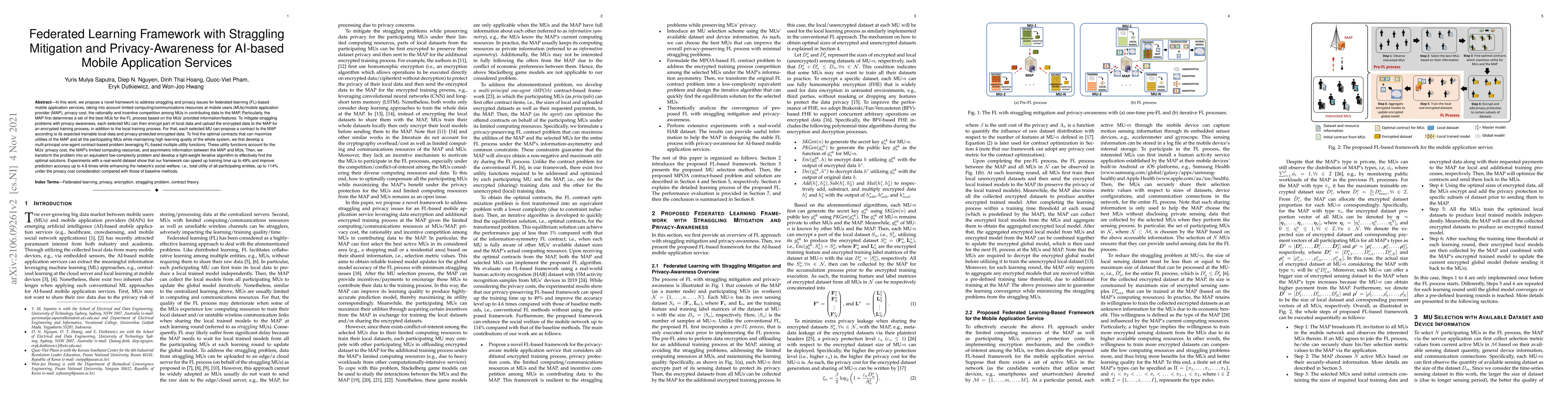 In this work, we propose a novel framework to address straggling and privacy issues for federated learning (FL)-based mobile application services, taking into account limited computing/communications resources at mobile users (MUs)/mobile application provider (MAP), privacy cost, the rationality and incentive competition among MUs in contributing data to the MAP. Particularly, the MAP first determines a set of the best MUs for the FL process based on the MUs' provided information/features. To mitigate straggling problems with privacy-awareness, each selected MU can then encrypt part of local data and upload the encrypted data to the MAP for an encrypted training process, in addition to the local training process. For that, each selected MU can propose a contract to the MAP according to its expected trainable local data and privacy-protected encrypted data. To find the optimal contracts that can maximize utilities of the MAP and all the participating MUs while maintaining high learning quality of the whole system, we first develop a multi-principal one-agent contract-based problem leveraging FL-based multiple utility functions. These utility functions account for the MUs' privacy cost, the MAP's limited computing resources, and asymmetric information between the MAP and MUs. Then, we transform the problem into an equivalent low-complexity problem and develop a light-weight iterative algorithm to effectively find the optimal solutions. Experiments with a real-world dataset show that our framework can speed up training time up to 49% and improve prediction accuracy up to 4.6 times while enhancing the network's social welfare, i.e., total utility of all participating entities, up to 114% under the privacy cost consideration compared with those of baseline methods.