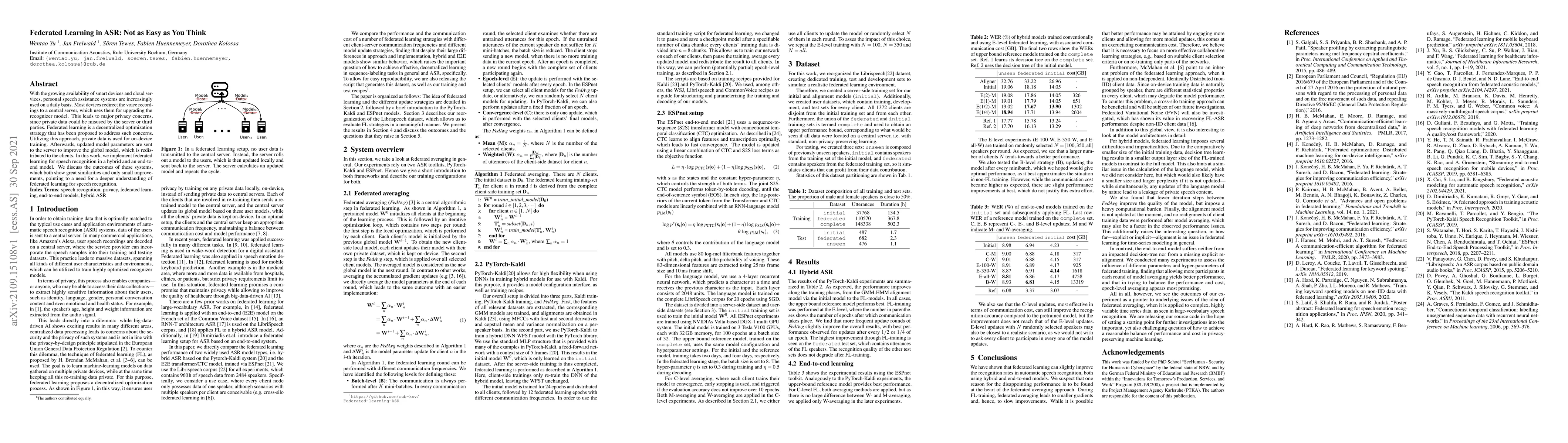 With the growing availability of smart devices and cloud services, personal speech assistance systems are increasingly used on a daily basis. Most devices redirect the voice recordings to a central server, which uses them for upgrading the recognizer model. This leads to major privacy concerns, since private data could be misused by the server or third parties. Federated learning is a decentralized optimization strategy that has been proposed to address such concerns. Utilizing this approach, private data is used for on-device training. Afterwards, updated model parameters are sent to the server to improve the global model, which is redistributed to the clients. In this work, we implement federated learning for speech recognition in a hybrid and an end-to-end model. We discuss the outcomes of these systems, which both show great similarities and only small improvements, pointing to a need for a deeper understanding of federated learning for speech recognition.