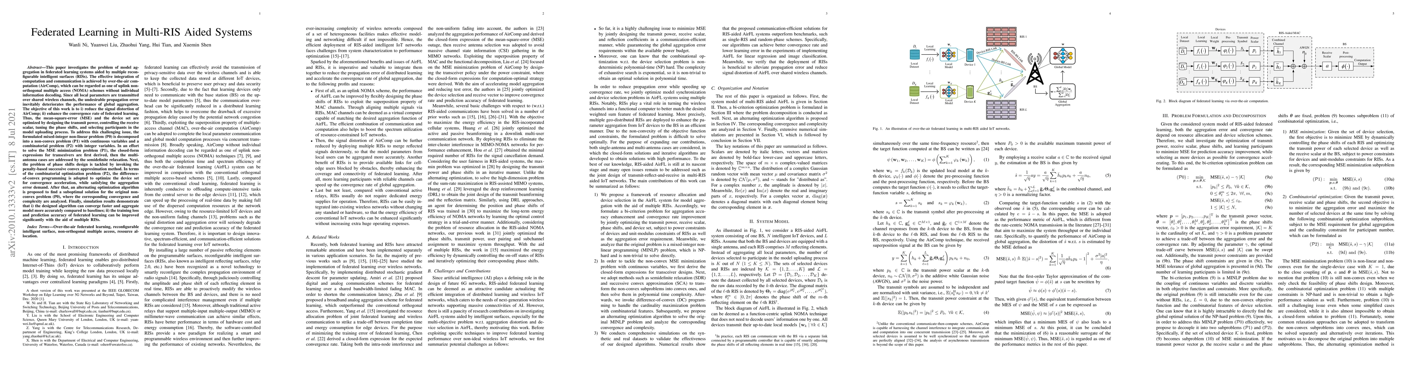 This research explores federated learning with multiple reconfigurable intelligent surfaces (RISs) to improve model aggregation. It aims to reduce signal distortion and enhance convergence rate by optimizing transmit power, receive scalar, phase shifts, and participant selection. The complex problem is decomposed and solved using various methods, leading to faster convergence and more accurate model aggregation, significantly boosting federated learning performance with RIS assistance.