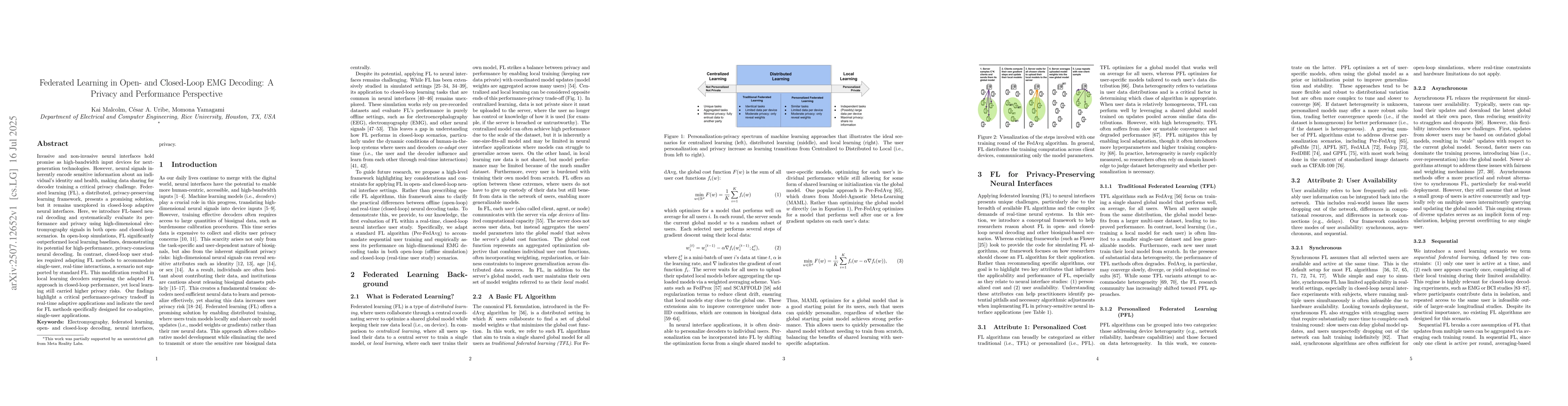 Invasive and non-invasive neural interfaces hold promise as high-bandwidth input devices for next-generation technologies. However, neural signals inherently encode sensitive information about an individual's identity and health, making data sharing for decoder training a critical privacy challenge. Federated learning (FL), a distributed, privacy-preserving learning framework, presents a promising solution, but it remains unexplored in closed-loop adaptive neural interfaces. Here, we introduce FL-based neural decoding and systematically evaluate its performance and privacy using high-dimensional electromyography signals in both open- and closed-loop scenarios. In open-loop simulations, FL significantly outperformed local learning baselines, demonstrating its potential for high-performance, privacy-conscious neural decoding. In contrast, closed-loop user studies required adapting FL methods to accommodate single-user, real-time interactions, a scenario not supported by standard FL. This modification resulted in local learning decoders surpassing the adapted FL approach in closed-loop performance, yet local learning still carried higher privacy risks. Our findings highlight a critical performance-privacy tradeoff in real-time adaptive applications and indicate the need for FL methods specifically designed for co-adaptive, single-user applications.