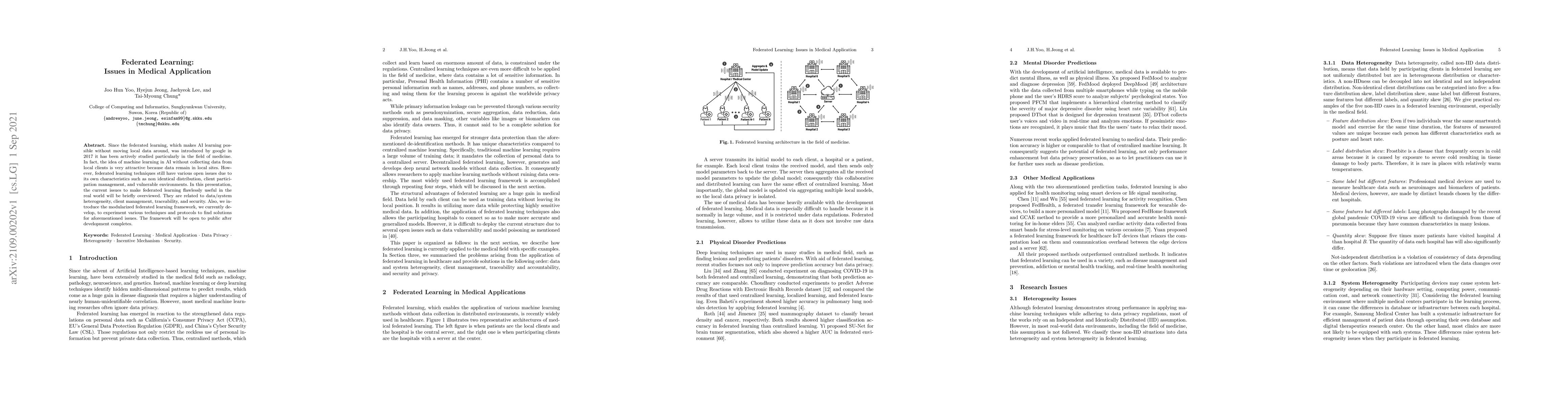 Since the federated learning, which makes AI learning possible without moving local data around, was introduced by google in 2017 it has been actively studied particularly in the field of medicine. In fact, the idea of machine learning in AI without collecting data from local clients is very attractive because data remain in local sites. However, federated learning techniques still have various open issues due to its own characteristics such as non identical distribution, client participation management, and vulnerable environments. In this presentation, the current issues to make federated learning flawlessly useful in the real world will be briefly overviewed. They are related to data/system heterogeneity, client management, traceability, and security. Also, we introduce the modularized federated learning framework, we currently develop, to experiment various techniques and protocols to find solutions for aforementioned issues. The framework will be open to public after development completes.