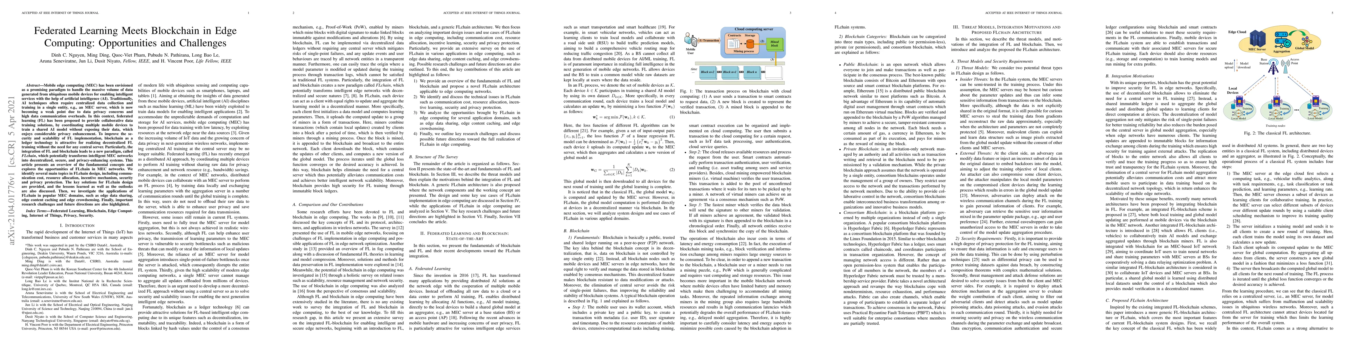 This paper explores the integration of federated learning (FL) with blockchain in mobile edge computing (MEC) to enhance privacy and security. It introduces FLchain, a new paradigm that leverages blockchain to decentralize FL training, addressing challenges like communication cost, resource allocation, and security. The paper discusses applications in edge data sharing, content caching, and crowdsensing, while also highlighting key research challenges and future directions.