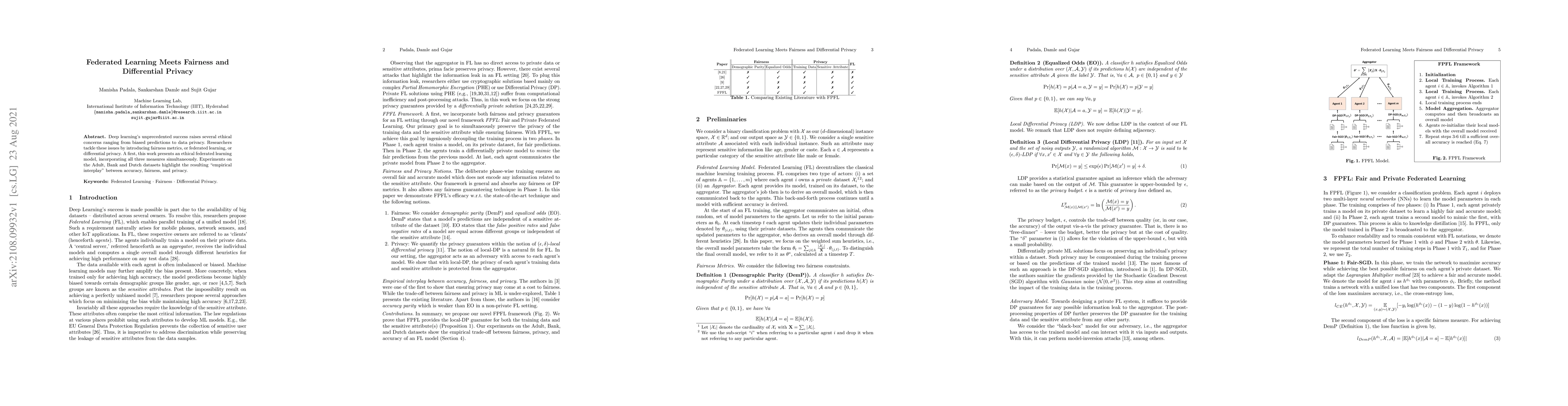 Deep learning's unprecedented success raises several ethical concerns ranging from biased predictions to data privacy. Researchers tackle these issues by introducing fairness metrics, or federated learning, or differential privacy. A first, this work presents an ethical federated learning model, incorporating all three measures simultaneously. Experiments on the Adult, Bank and Dutch datasets highlight the resulting ``empirical interplay" between accuracy, fairness, and privacy.