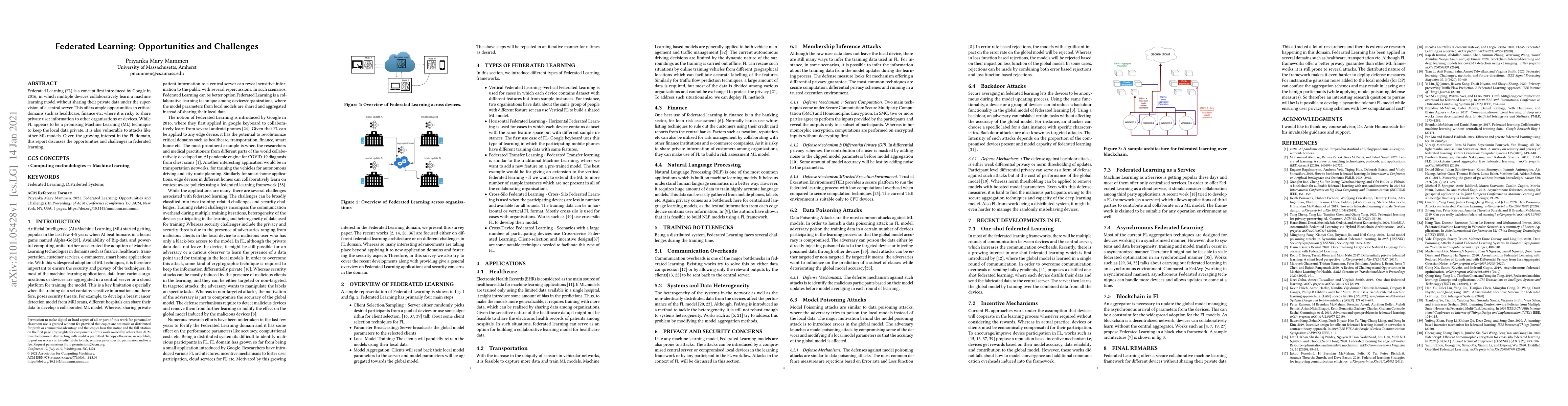Federated Learning (FL) is a concept first introduced by Google in 2016, in which multiple devices collaboratively learn a machine learning model without sharing their private data under the supervision of a central server. This offers ample opportunities in critical domains such as healthcare, finance etc, where it is risky to share private user information to other organisations or devices. While FL appears to be a promising Machine Learning (ML) technique to keep the local data private, it is also vulnerable to attacks like other ML models. Given the growing interest in the FL domain, this report discusses the opportunities and challenges in federated learning.