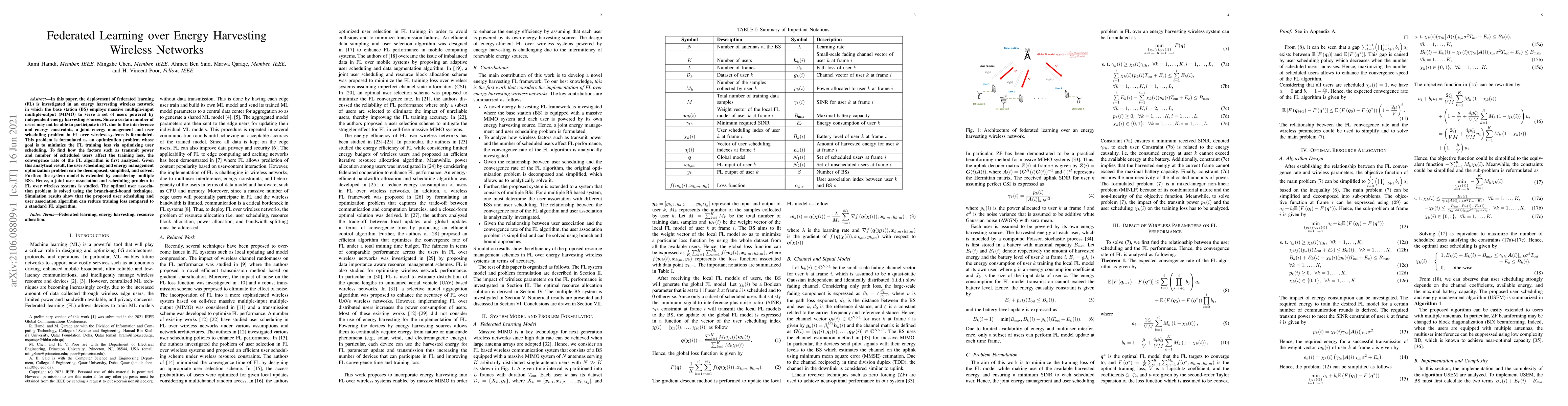 In this paper, the deployment of federated learning (FL) is investigated in an energy harvesting wireless network in which the base station (BS) employs massive multiple-input multiple-output (MIMO) to serve a set of users powered by independent energy harvesting sources. Since a certain number of users may not be able to participate in FL due to the interference and energy constraints, a joint energy management and user scheduling problem in FL over wireless systems is formulated. This problem is formulated as an optimization problem whose goal is to minimize the FL training loss via optimizing user scheduling. To find how the factors such as transmit power and number of scheduled users affect the training loss, the convergence rate of the FL algorithm is first analyzed. Given this analytical result, the user scheduling and energy management optimization problem can be decomposed, simplified, and solved. Further, the system model is extended by considering multiple BSs. Hence, a joint user association and scheduling problem in FL over wireless systems is studied. The optimal user association problem is solved using the branch-and-bound technique. Simulation results show that the proposed user scheduling and user association algorithm can reduce training loss compared to a standard FL algorithm.