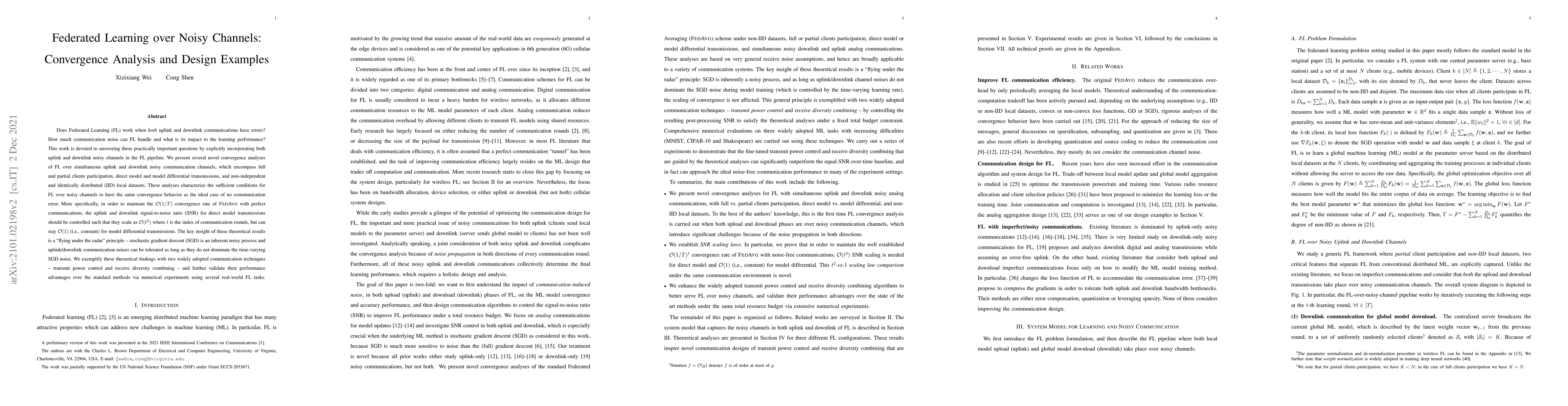This paper investigates Federated Learning (FL) performance under noisy communication channels, analyzing convergence conditions for both uplink and downlink errors. It reveals that maintaining an O(1/T) convergence rate requires uplink and downlink signal-to-noise ratio scaling as O(t^2) for direct model transmissions, but constant SNR for model differential transmissions.