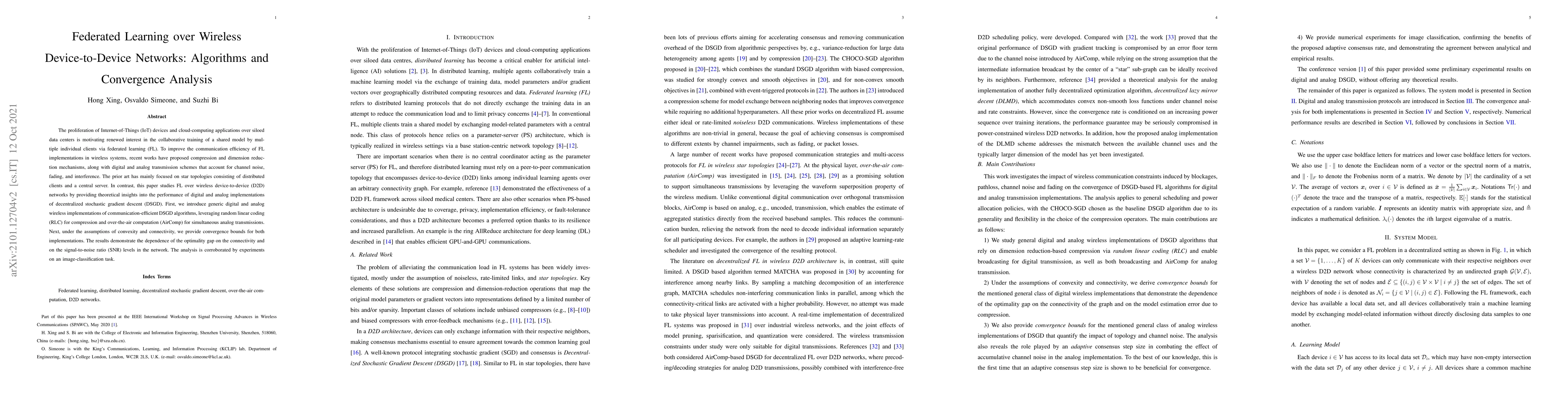 This paper explores federated learning (FL) over wireless device-to-device (D2D) networks, introducing digital and analog implementations of decentralized stochastic gradient descent (DSGD) with compression and simultaneous analog transmissions. The paper provides theoretical convergence bounds and demonstrates the impact of network connectivity and signal-to-noise ratio on the optimality gap, supported by experiments on image classification.