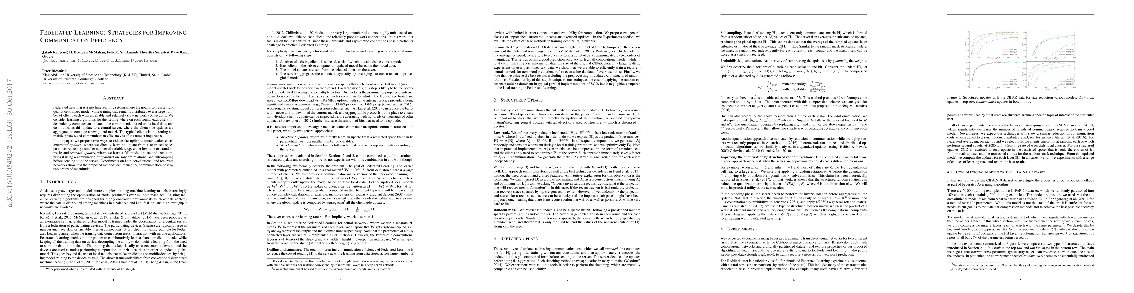 Federated Learning is a machine learning setting where the goal is to train a high-quality centralized model while training data remains distributed over a large number of clients each with unreliable and relatively slow network connections. We consider learning algorithms for this setting where on each round, each client independently computes an update to the current model based on its local data, and communicates this update to a central server, where the client-side updates are aggregated to compute a new global model. The typical clients in this setting are mobile phones, and communication efficiency is of the utmost importance. In this paper, we propose two ways to reduce the uplink communication costs: structured updates, where we directly learn an update from a restricted space parametrized using a smaller number of variables, e.g. either low-rank or a random mask; and sketched updates, where we learn a full model update and then compress it using a combination of quantization, random rotations, and subsampling before sending it to the server. Experiments on both convolutional and recurrent networks show that the proposed methods can reduce the communication cost by two orders of magnitude.