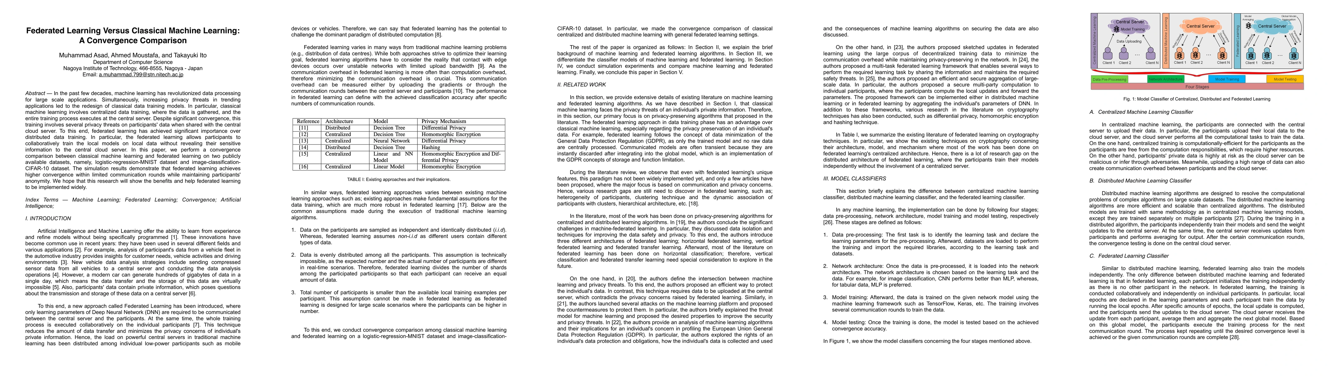 In the past few decades, machine learning has revolutionized data processing for large scale applications. Simultaneously, increasing privacy threats in trending applications led to the redesign of classical data training models. In particular, classical machine learning involves centralized data training, where the data is gathered, and the entire training process executes at the central server. Despite significant convergence, this training involves several privacy threats on participants' data when shared with the central cloud server. To this end, federated learning has achieved significant importance over distributed data training. In particular, the federated learning allows participants to collaboratively train the local models on local data without revealing their sensitive information to the central cloud server. In this paper, we perform a convergence comparison between classical machine learning and federated learning on two publicly available datasets, namely, logistic-regression-MNIST dataset and image-classification-CIFAR-10 dataset. The simulation results demonstrate that federated learning achieves higher convergence within limited communication rounds while maintaining participants' anonymity. We hope that this research will show the benefits and help federated learning to be implemented widely.