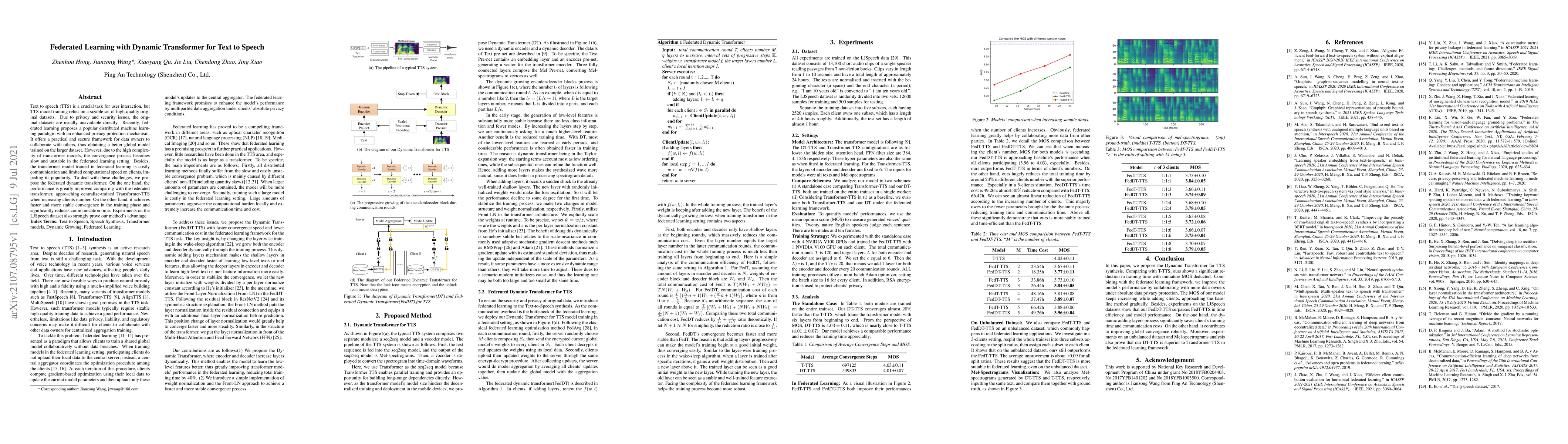 Text to speech (TTS) is a crucial task for user interaction, but TTS model training relies on a sizable set of high-quality original datasets. Due to privacy and security issues, the original datasets are usually unavailable directly. Recently, federated learning proposes a popular distributed machine learning paradigm with an enhanced privacy protection mechanism. It offers a practical and secure framework for data owners to collaborate with others, thus obtaining a better global model trained on the larger dataset. However, due to the high complexity of transformer models, the convergence process becomes slow and unstable in the federated learning setting. Besides, the transformer model trained in federated learning is costly communication and limited computational speed on clients, impeding its popularity. To deal with these challenges, we propose the federated dynamic transformer. On the one hand, the performance is greatly improved comparing with the federated transformer, approaching centralize-trained Transformer-TTS when increasing clients number. On the other hand, it achieves faster and more stable convergence in the training phase and significantly reduces communication time. Experiments on the LJSpeech dataset also strongly prove our method's advantage.