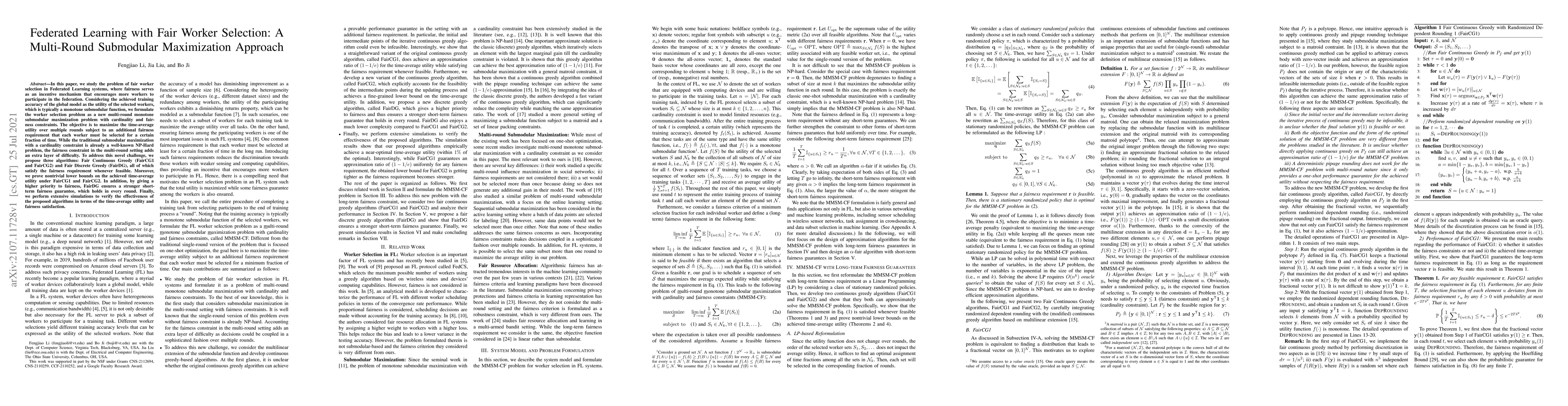 This paper proposes a multi-round submodular maximization approach for fair worker selection in Federated Learning systems, aiming to maximize training accuracy while ensuring each worker is selected fairly. It introduces three algorithms—Fair Continuous Greedy, Fair Discrete Greedy—and proves lower bounds on utility, demonstrating their effectiveness in simulations.