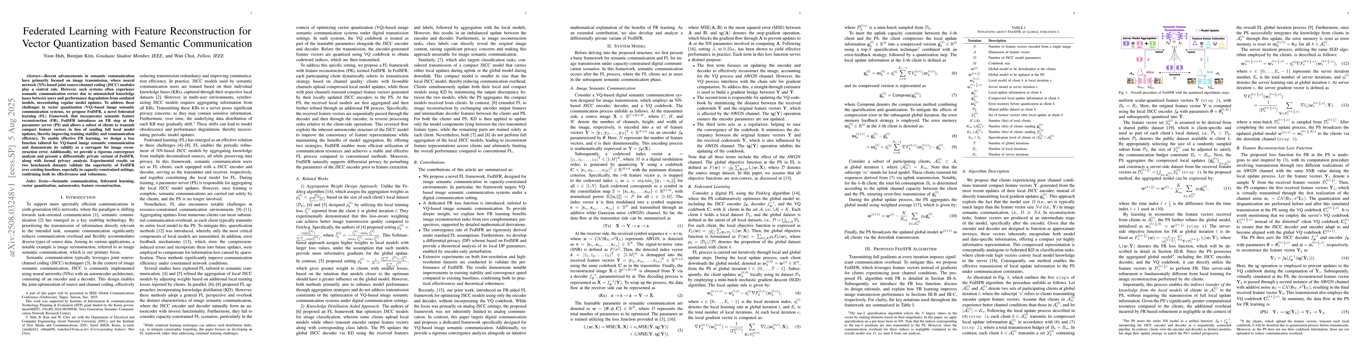 Recent advancements in semantic communication have primarily focused on image transmission, where neural network (NN)-based joint source-channel coding (JSCC) modules play a central role. However, such systems often experience semantic communication errors due to mismatched knowledge bases between users and performance degradation from outdated models, necessitating regular model updates. To address these challenges in vector quantization (VQ)-based image semantic communication systems, we propose FedSFR, a novel federated learning (FL) framework that incorporates semantic feature reconstruction (FR). FedSFR introduces an FR step at the parameter server (PS) and allows a subset of clients to transmit compact feature vectors in lieu of sending full local model updates, thereby improving training stability and communication efficiency. To enable effective FR learning, we design a loss function tailored for VQ-based image semantic communication and demonstrate its validity as a surrogate for image reconstruction error. Additionally, we provide a rigorous convergence analysis and present a differentially private variant of FedSFR, along with formal privacy analysis. Experimental results on two benchmark datasets validate the superiority of FedSFR over existing baselines, especially in capacity-constrained settings, confirming both its effectiveness and robustness.