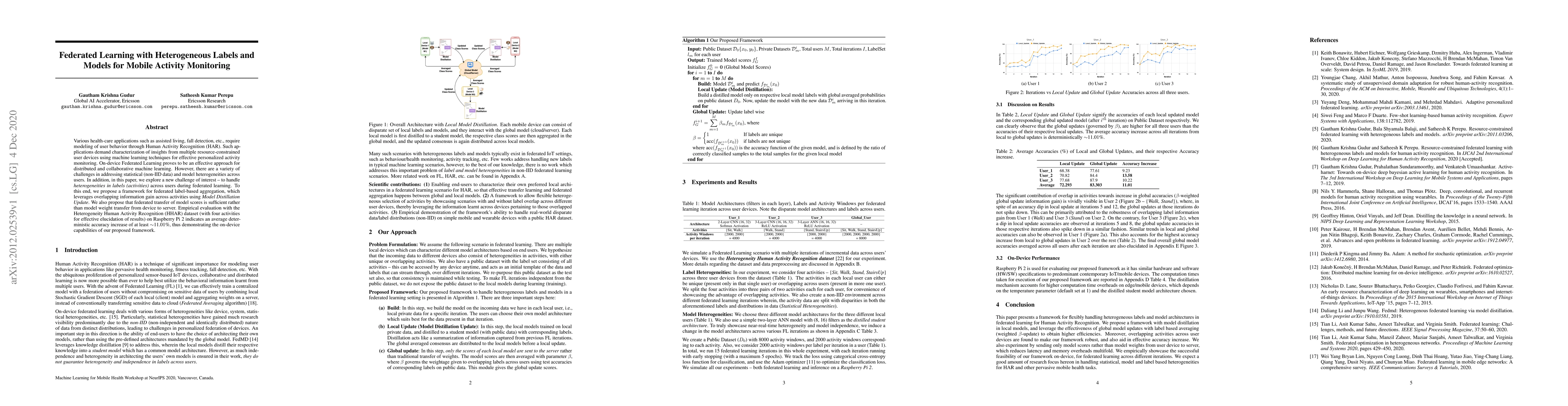 This paper proposes a federated learning framework for mobile activity monitoring that addresses heterogeneities in both labels and models across users. The framework uses federated label-based aggregation and model distillation to improve accuracy, achieving an average deterministic accuracy increase of ~11.01% on the HHAR dataset.