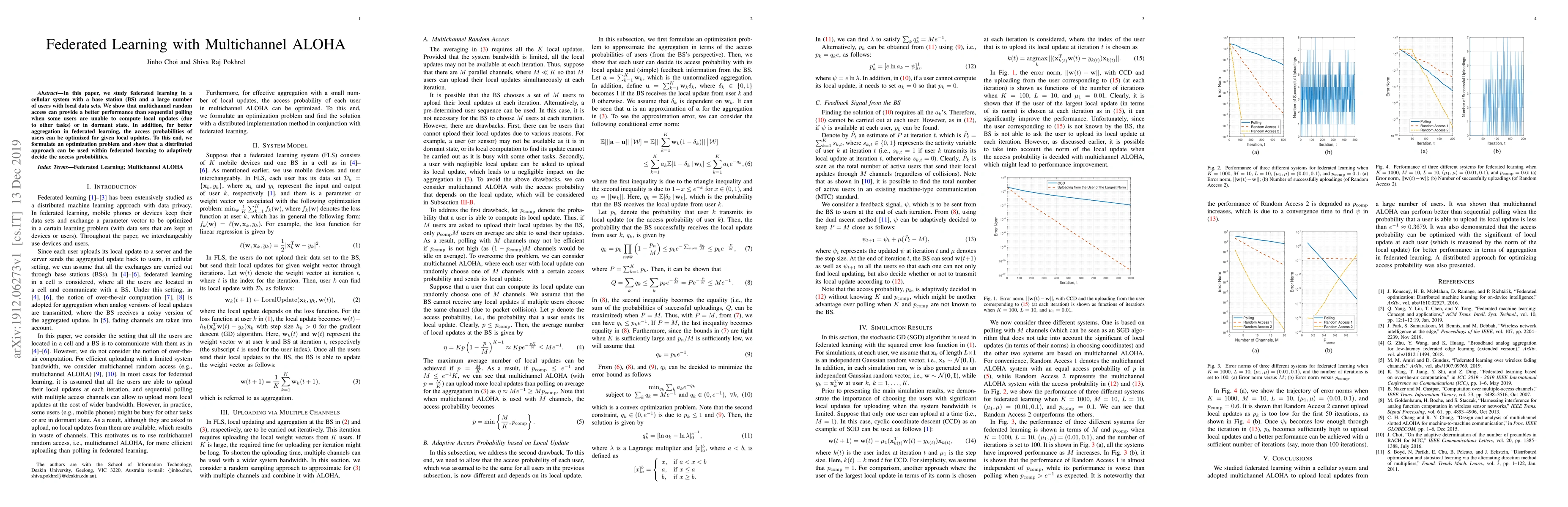 In this paper, we study federated learning in a cellular system with a base station (BS) and a large number of users with local data sets. We show that multichannel random access can provide a better performance than sequential polling when some users are unable to compute local updates (due to other tasks) or in dormant state. In addition, for better aggregation in federated learning, the access probabilities of users can be optimized for given local updates. To this end, we formulate an optimization problem and show that a distributed approach can be used within federated learning to adaptively decide the access probabilities.