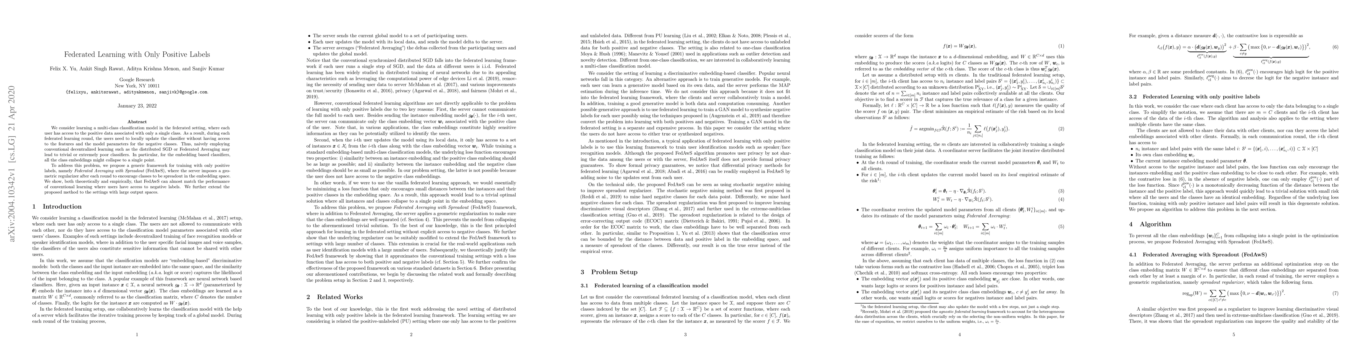 This paper proposes Federated Averaging with Spreadout (FedAwS), a framework for training multi-class classifiers in federated learning with only positive labels, addressing the issue of class embeddings collapsing. The method uses a geometric regularizer to spread out classes in the embedding space, achieving performance close to conventional learning methods.