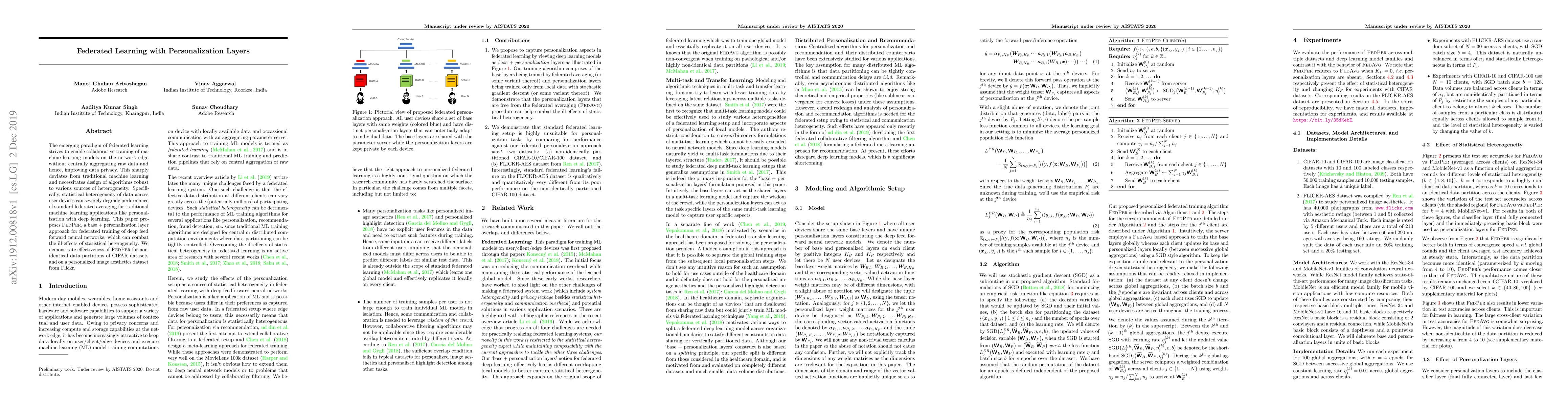The emerging paradigm of federated learning strives to enable collaborative training of machine learning models on the network edge without centrally aggregating raw data and hence, improving data privacy. This sharply deviates from traditional machine learning and necessitates the design of algorithms robust to various sources of heterogeneity. Specifically, statistical heterogeneity of data across user devices can severely degrade the performance of standard federated averaging for traditional machine learning applications like personalization with deep learning. This paper pro-posesFedPer, a base + personalization layer approach for federated training of deep feedforward neural networks, which can combat the ill-effects of statistical heterogeneity. We demonstrate effectiveness ofFedPerfor non-identical data partitions ofCIFARdatasetsand on a personalized image aesthetics dataset from Flickr.
