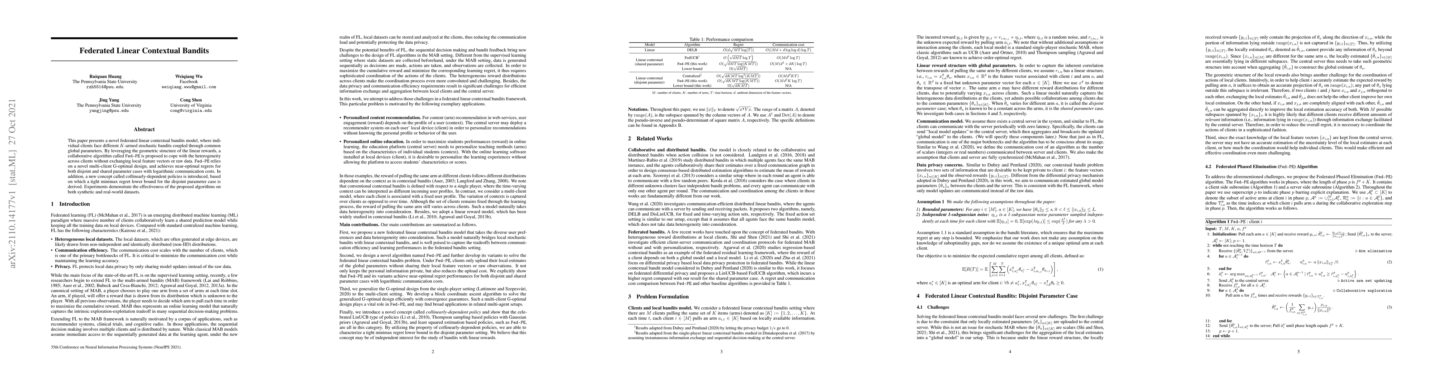 This paper introduces a federated linear contextual bandits model, proposing the Fed-PE algorithm to manage client heterogeneity without data sharing. The algorithm achieves near-optimal performance with low communication costs and demonstrates effectiveness on both synthetic and real-world datasets.