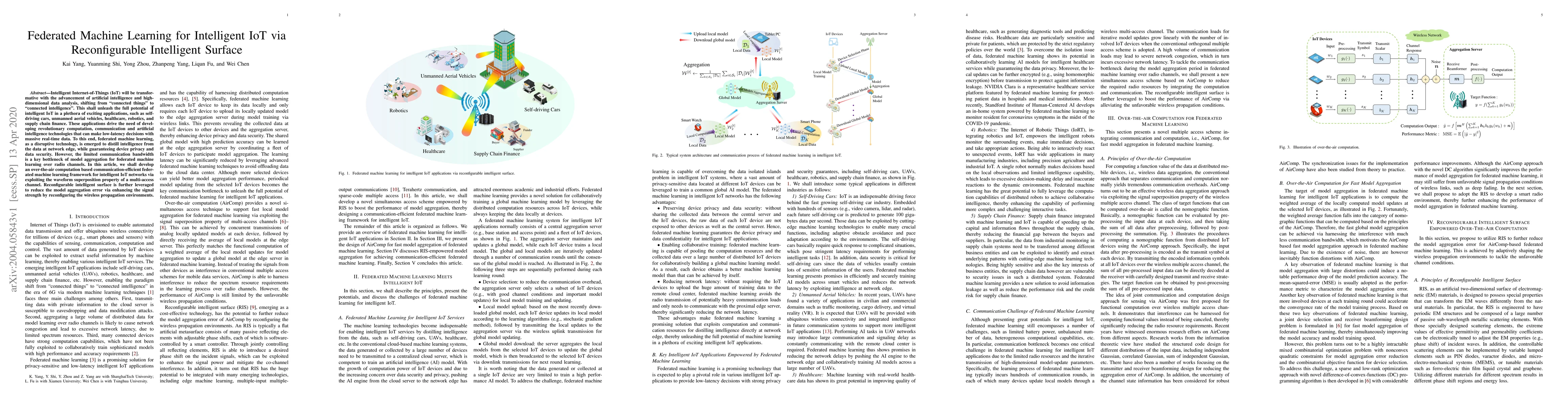 This paper proposes a communication-efficient federated machine learning framework for intelligent IoT networks, leveraging reconfigurable intelligent surfaces to enhance signal strength and reduce model aggregation error, while ensuring device privacy and data security.