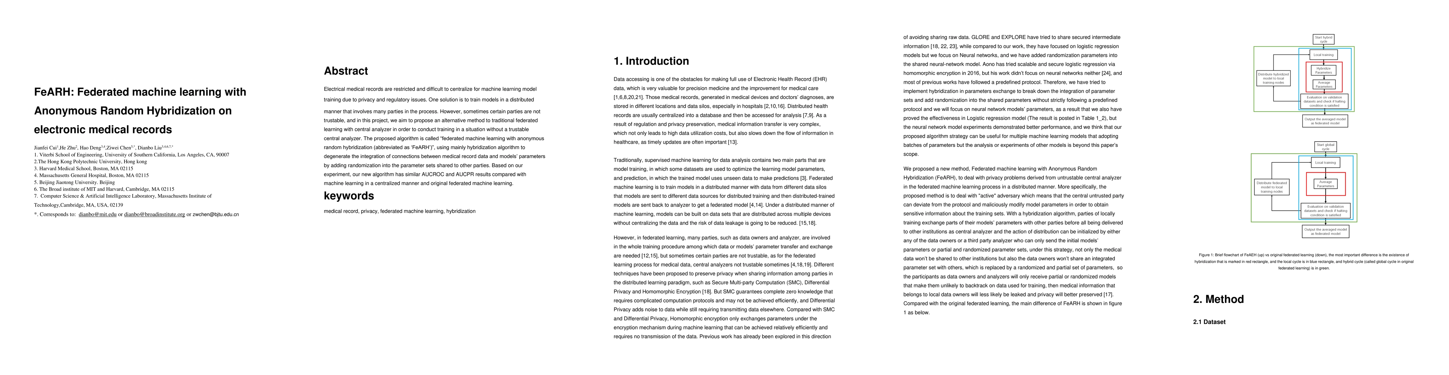 Sometimes electrical medical records are restricted and difficult to centralize for machine learning, which could only be trained in distributed manner that involved many institutions in the process. However, sometimes some institutions are likely to figure out the private data used for training certain models based on the parameters they obtained, which is a violation of privacy and certain regulations. Under those circumstances, we develop an algorithm, called 'federated machine learning with anonymous random hybridization'(abbreviated as 'FeARH'), using mainly hybridization algorithm to eliminate connections between medical record data and models' parameters, which avoid untrustworthy institutions from stealing patients' private medical records. Based on our experiment, our new algorithm has similar AUCROC and AUCPR result compared with machine learning in centralized manner and original federated machine learning, at the same time, our algorithm can greatly reduce data transfer size in comparison with original federated machine learning.