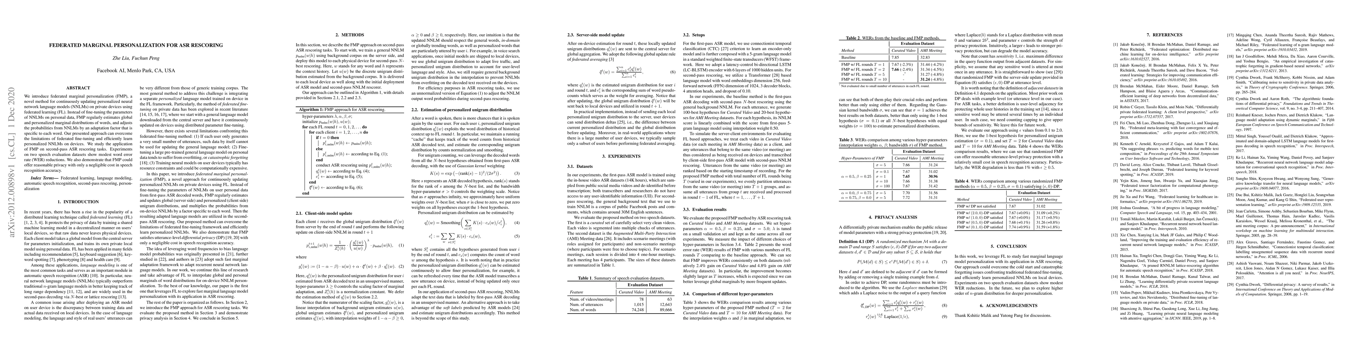 The paper proposes federated marginal personalization (FMP) for updating personalized neural network language models on private devices via federated learning without full parameter fine-tuning, achieving modest word error rate reductions in ASR rescoring tasks while maintaining privacy.