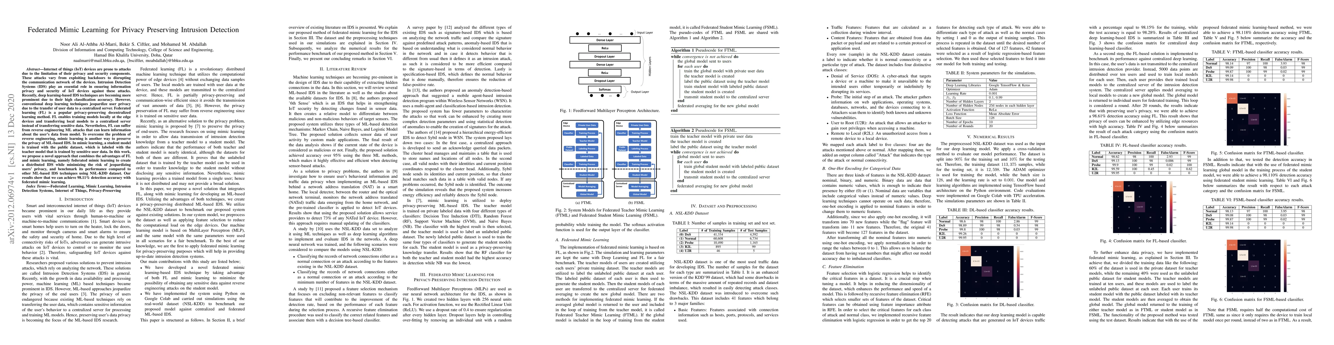 Internet of things (IoT) devices are prone to attacks due to the limitation of their privacy and security components. These attacks vary from exploiting backdoors to disrupting the communication network of the devices. Intrusion Detection Systems (IDS) play an essential role in ensuring information privacy and security of IoT devices against these attacks. Recently, deep learning-based IDS techniques are becoming more prominent due to their high classification accuracy. However, conventional deep learning techniques jeopardize user privacy due to the transfer of user data to a centralized server. Federated learning (FL) is a popular privacy-preserving decentralized learning method. FL enables training models locally at the edge devices and transferring local models to a centralized server instead of transferring sensitive data. Nevertheless, FL can suffer from reverse engineering ML attacks that can learn information about the user's data from model. To overcome the problem of reverse engineering, mimic learning is another way to preserve the privacy of ML-based IDS. In mimic learning, a student model is trained with the public dataset, which is labeled with the teacher model that is trained by sensitive user data. In this work, we propose a novel approach that combines the advantages of FL and mimic learning, namely federated mimic learning to create a distributed IDS while minimizing the risk of jeopardizing users' privacy, and benchmark its performance compared to other ML-based IDS techniques using NSL-KDD dataset. Our results show that we can achieve 98.11% detection accuracy with federated mimic learning.