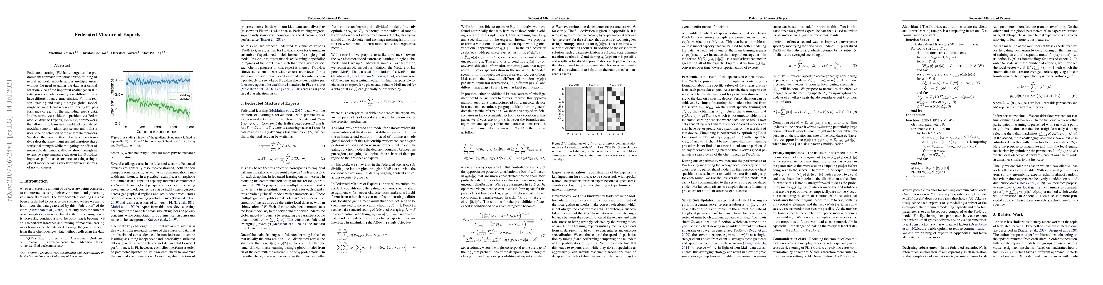 The paper proposes Federated Mixture of Experts (FedMix), a framework to address data heterogeneity in federated learning by training an ensemble of specialized models that adaptively select and train user-specific subsets. Empirical results show that FedMix improves performance over a single global model, especially in non-i.i.d. data scenarios.