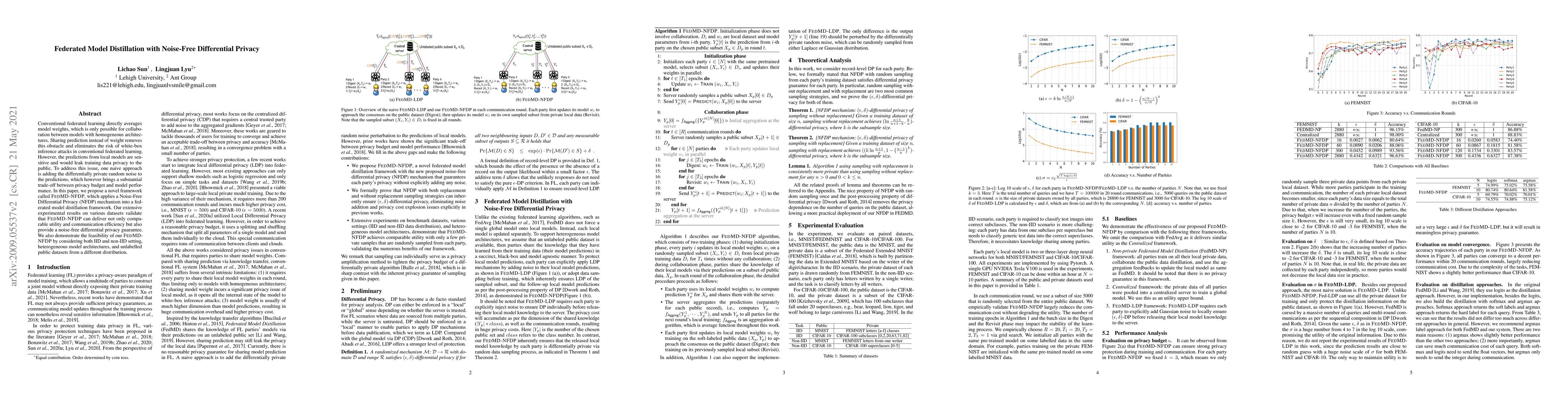 Researchers propose FEDMD-NFDP, a federated learning framework that balances model performance with noise-free differential privacy through Noise-Free Differential Privacy (NFDP) mechanism, achieving comparable utility and communication efficiency while guaranteeing privacy.
