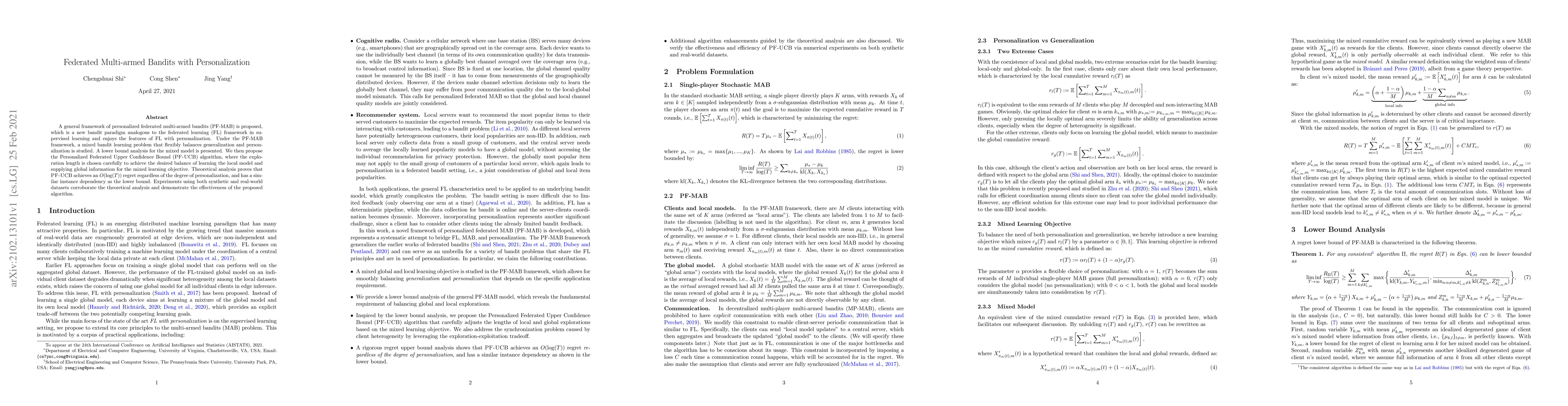 A general framework of personalized federated multi-armed bandits (PF-MAB) is proposed, which is a new bandit paradigm analogous to the federated learning (FL) framework in supervised learning and enjoys the features of FL with personalization. Under the PF-MAB framework, a mixed bandit learning problem that flexibly balances generalization and personalization is studied. A lower bound analysis for the mixed model is presented. We then propose the Personalized Federated Upper Confidence Bound (PF-UCB) algorithm, where the exploration length is chosen carefully to achieve the desired balance of learning the local model and supplying global information for the mixed learning objective. Theoretical analysis proves that PF-UCB achieves an $O(\log(T))$ regret regardless of the degree of personalization, and has a similar instance dependency as the lower bound. Experiments using both synthetic and real-world datasets corroborate the theoretical analysis and demonstrate the effectiveness of the proposed algorithm.