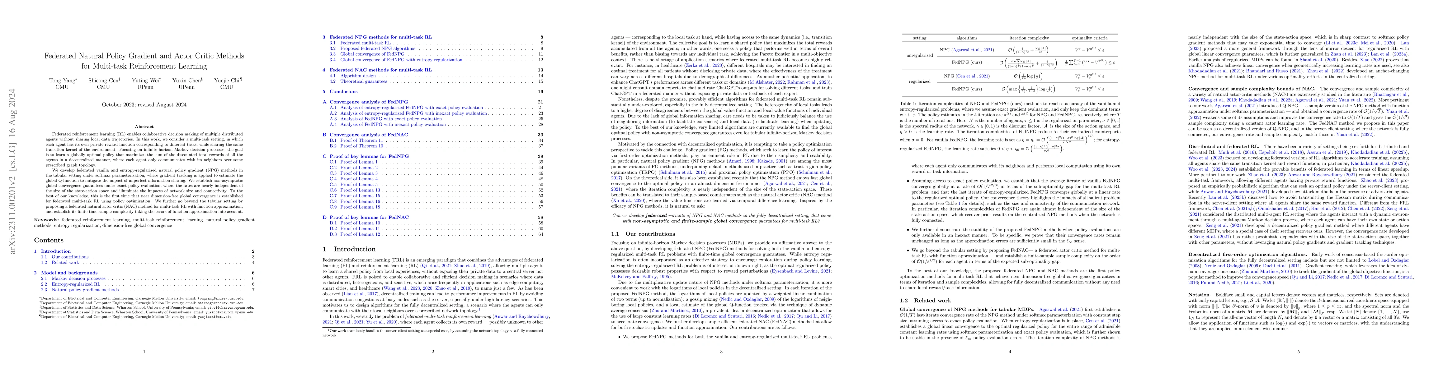 This paper proposes federated natural policy gradient methods for multi-task reinforcement learning in decentralized environments, where agents share a common environment but have distinct reward functions. The developed algorithms achieve global convergence guarantees, demonstrating robustness to imperfect information sharing and network topology variations.