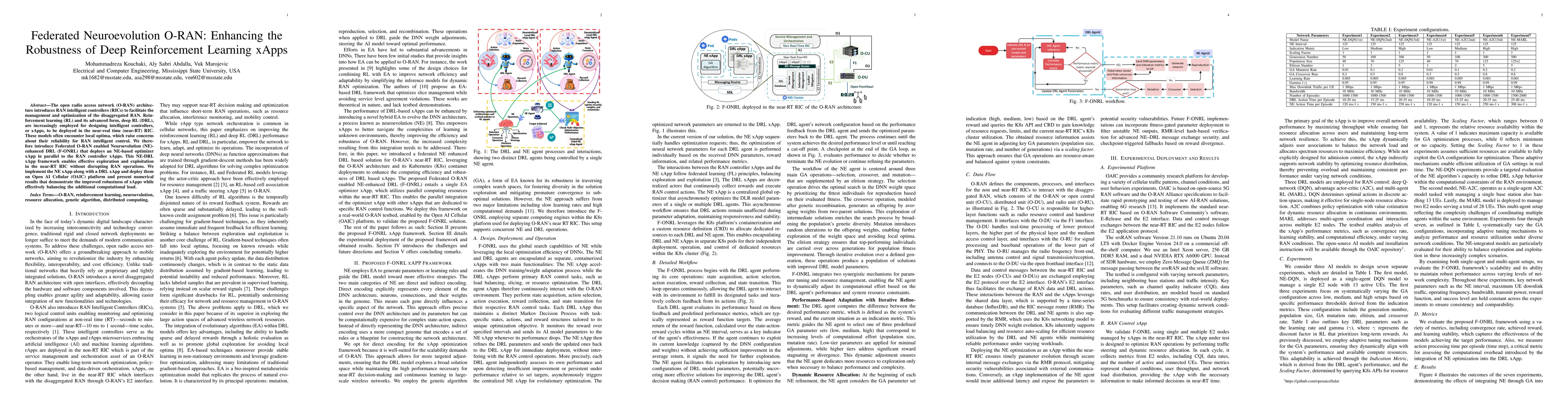 The open radio access network (O-RAN) architecture introduces RAN intelligent controllers (RICs) to facilitate the management and optimization of the disaggregated RAN. Reinforcement learning (RL) and its advanced form, deep RL (DRL), are increasingly employed for designing intelligent controllers, or xApps, to be deployed in the near-real time (near-RT) RIC. These models often encounter local optima, which raise concerns about their reliability for RAN intelligent control. We therefore introduce Federated O-RAN enabled Neuroevolution (NE)-enhanced DRL (F-ONRL) that deploys an NE-based optimizer xApp in parallel to the RAN controller xApps. This NE-DRL xApp framework enables effective exploration and exploitation in the near-RT RIC without disrupting RAN operations. We implement the NE xApp along with a DRL xApp and deploy them on Open AI Cellular (OAIC) platform and present numerical results that demonstrate the improved robustness of xApps while effectively balancing the additional computational load.