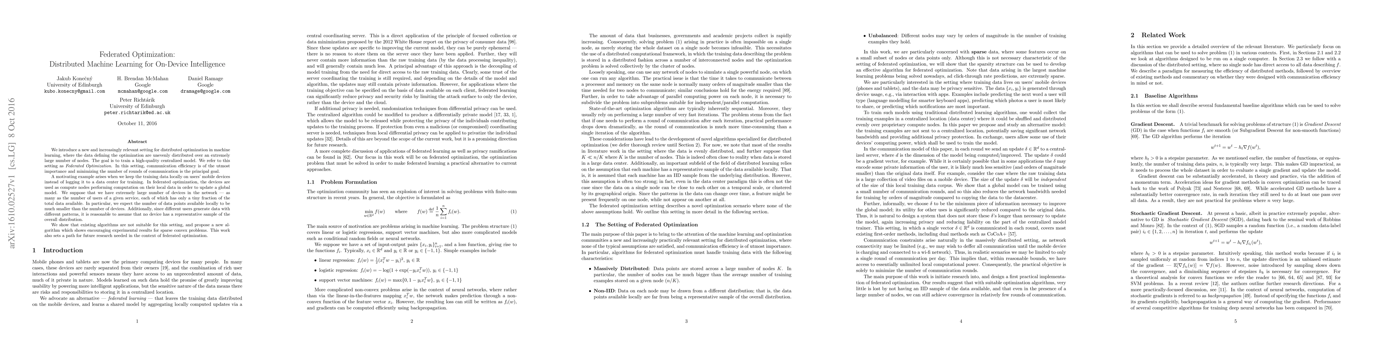 We introduce a new and increasingly relevant setting for distributed optimization in machine learning, where the data defining the optimization are unevenly distributed over an extremely large number of nodes. The goal is to train a high-quality centralized model. We refer to this setting as Federated Optimization. In this setting, communication efficiency is of the utmost importance and minimizing the number of rounds of communication is the principal goal. A motivating example arises when we keep the training data locally on users' mobile devices instead of logging it to a data center for training. In federated optimziation, the devices are used as compute nodes performing computation on their local data in order to update a global model. We suppose that we have extremely large number of devices in the network --- as many as the number of users of a given service, each of which has only a tiny fraction of the total data available. In particular, we expect the number of data points available locally to be much smaller than the number of devices. Additionally, since different users generate data with different patterns, it is reasonable to assume that no device has a representative sample of the overall distribution. We show that existing algorithms are not suitable for this setting, and propose a new algorithm which shows encouraging experimental results for sparse convex problems. This work also sets a path for future research needed in the context of \federated optimization.