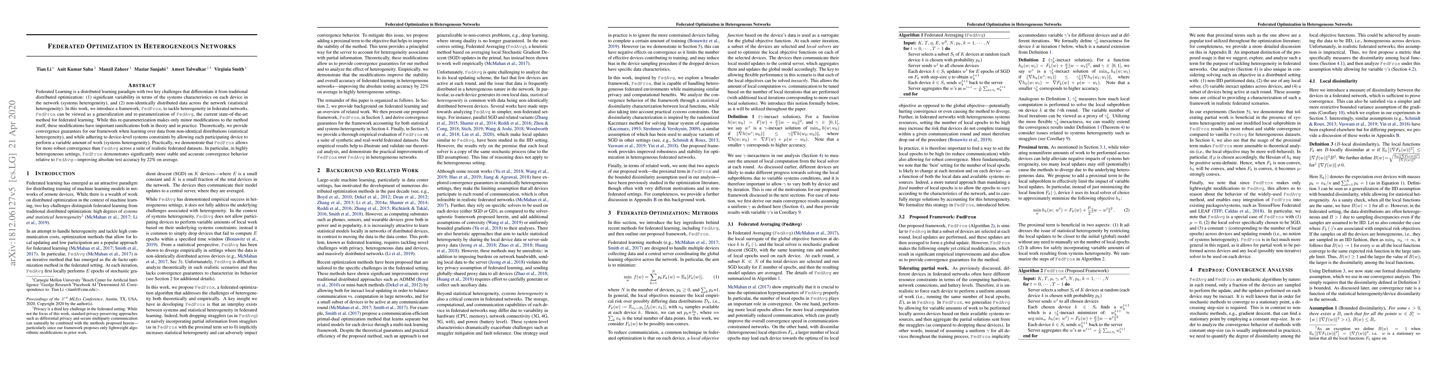 Federated Learning is a distributed learning paradigm with two key challenges that differentiate it from traditional distributed optimization: (1) significant variability in terms of the systems characteristics on each device in the network (systems heterogeneity), and (2) non-identically distributed data across the network (statistical heterogeneity). In this work, we introduce a framework, FedProx, to tackle heterogeneity in federated networks. FedProx can be viewed as a generalization and re-parametrization of FedAvg, the current state-of-the-art method for federated learning. While this re-parameterization makes only minor modifications to the method itself, these modifications have important ramifications both in theory and in practice. Theoretically, we provide convergence guarantees for our framework when learning over data from non-identical distributions (statistical heterogeneity), and while adhering to device-level systems constraints by allowing each participating device to perform a variable amount of work (systems heterogeneity). Practically, we demonstrate that FedProx allows for more robust convergence than FedAvg across a suite of realistic federated datasets. In particular, in highly heterogeneous settings, FedProx demonstrates significantly more stable and accurate convergence behavior relative to FedAvg---improving absolute test accuracy by 22% on average.