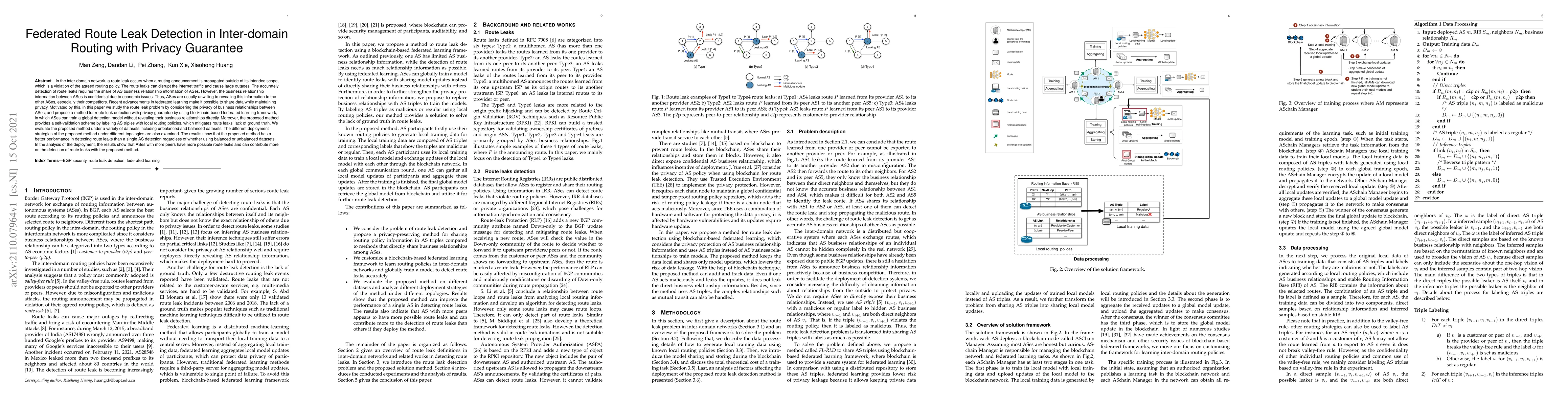 In the inter-domain network, a route leak occurs when a routing announcement is propagated outside of its intended scope, which is a violation of the agreed routing policy. The route leaks can disrupt the internet traffic and cause large outages. The accurately detection of route leaks requires the share of AS business relationship information of ASes. However, the business relationship information between ASes is confidential due to economic issues. Thus, ASes are usually unwilling to revealing this information to the other ASes, especially their competitors. Recent advancements in federated learning make it possible to share data while maintaining privacy. Motivated by this, in this paper we study the route leak problem by considering the privacy of business relationships between ASes, and propose a method for route leak detection with privacy guarantee by using blockchain-based federated learning framework, in which ASes can train a global detection model without revealing their business relationships directly. Moreover, the proposed method provides a self-validation scheme by labeling AS triples with local routing policies, which mitigates route leaks' lack of ground truth. We evaluate the proposed method under a variety of datasets including unbalanced and balanced datasets. The different deployment strategies of the proposed method under different topologies are also examined. The results show that the proposed method has a better performance in detecting route leaks than a single AS detection regardless of whether using balanced or unbalanced datasets. In the analysis of the deployment, the results show that ASes with more peers have more possible route leaks and can contribute more on the detection of route leaks with the proposed method.