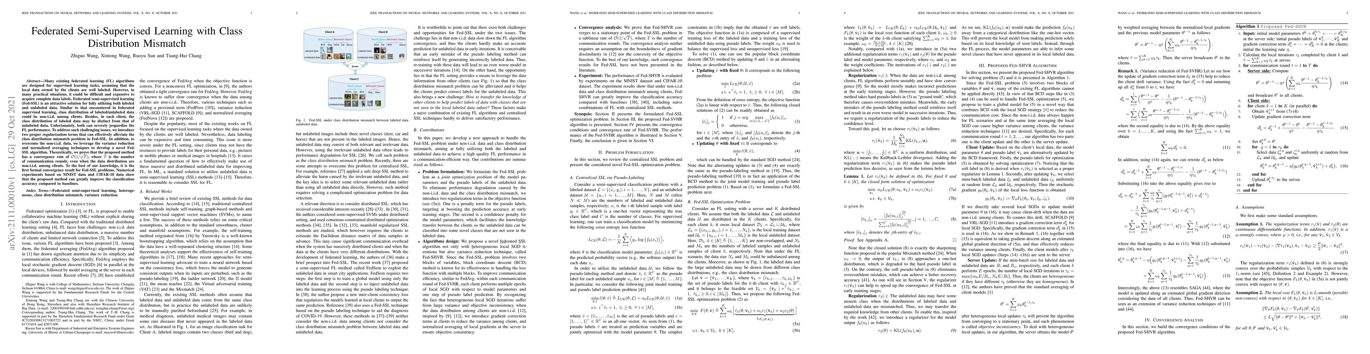 This paper proposes a novel federated semi-supervised learning algorithm to tackle class distribution mismatch and non-i.i.d. data among clients. It introduces regularization terms and leverages variance reduction and normalized averaging techniques, achieving a convergence rate of $\mathcal{O}(1/\sqrt{T})$ and demonstrating improved classification accuracy on MNIST and CIFAR-10 datasets.