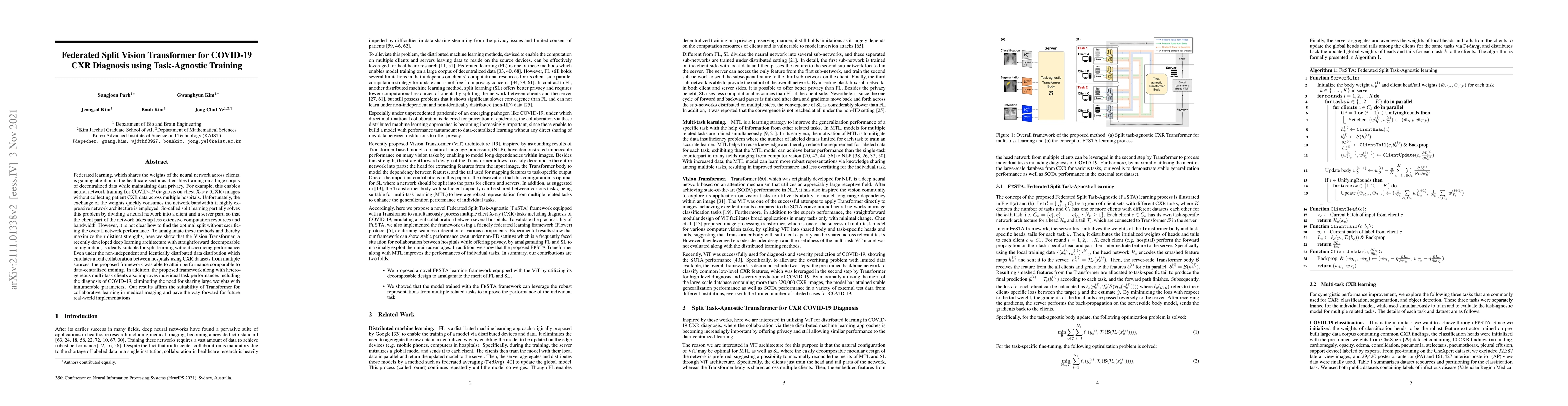 This paper proposes a federated split Vision Transformer for COVID-19 diagnosis using chest X-ray images, leveraging task-agnostic training to optimize data privacy and bandwidth efficiency. The framework effectively balances performance and resource distribution, achieving results comparable to centralized training while minimizing the need for large weight exchanges.