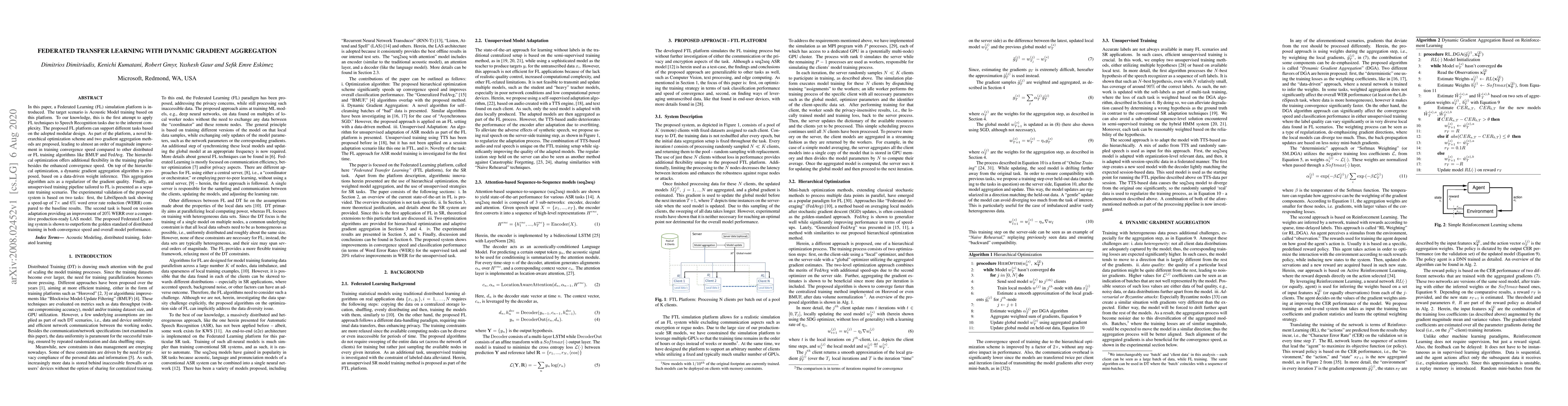 In this paper, a Federated Learning (FL) simulation platform is introduced. The target scenario is Acoustic Model training based on this platform. To our knowledge, this is the first attempt to apply FL techniques to Speech Recognition tasks due to the inherent complexity. The proposed FL platform can support different tasks based on the adopted modular design. As part of the platform, a novel hierarchical optimization scheme and two gradient aggregation methods are proposed, leading to almost an order of magnitude improvement in training convergence speed compared to other distributed or FL training algorithms like BMUF and FedAvg. The hierarchical optimization offers additional flexibility in the training pipeline besides the enhanced convergence speed. On top of the hierarchical optimization, a dynamic gradient aggregation algorithm is proposed, based on a data-driven weight inference. This aggregation algorithm acts as a regularizer of the gradient quality. Finally, an unsupervised training pipeline tailored to FL is presented as a separate training scenario. The experimental validation of the proposed system is based on two tasks: first, the LibriSpeech task showing a speed-up of 7x and 6% Word Error Rate reduction (WERR) compared to the baseline results. The second task is based on session adaptation providing an improvement of 20% WERR over a competitive production-ready LAS model. The proposed Federated Learning system is shown to outperform the golden standard of distributed training in both convergence speed and overall model performance.