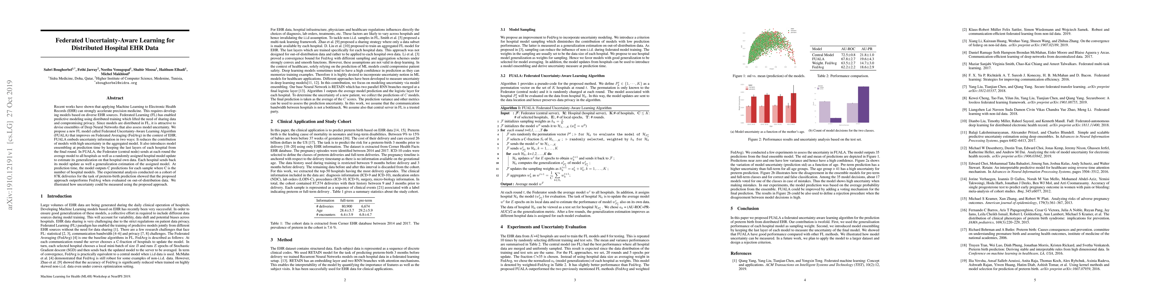 Recent works have shown that applying Machine Learning to Electronic Health Records (EHR) can strongly accelerate precision medicine. This requires developing models based on diverse EHR sources. Federated Learning (FL) has enabled predictive modeling using distributed training which lifted the need of sharing data and compromising privacy. Since models are distributed in FL, it is attractive to devise ensembles of Deep Neural Networks that also assess model uncertainty. We propose a new FL model called Federated Uncertainty-Aware Learning Algorithm (FUALA) that improves on Federated Averaging (FedAvg) in the context of EHR. FUALA embeds uncertainty information in two ways: It reduces the contribution of models with high uncertainty in the aggregated model. It also introduces model ensembling at prediction time by keeping the last layers of each hospital from the final round. In FUALA, the Federator (central node) sends at each round the average model to all hospitals as well as a randomly assigned hospital model update to estimate its generalization on that hospital own data. Each hospital sends back its model update as well a generalization estimation of the assigned model. At prediction time, the model outputs C predictions for each sample where C is the number of hospital models. The experimental analysis conducted on a cohort of 87K deliveries for the task of preterm-birth prediction showed that the proposed approach outperforms FedAvg when evaluated on out-of-distribution data. We illustrated how uncertainty could be measured using the proposed approach.