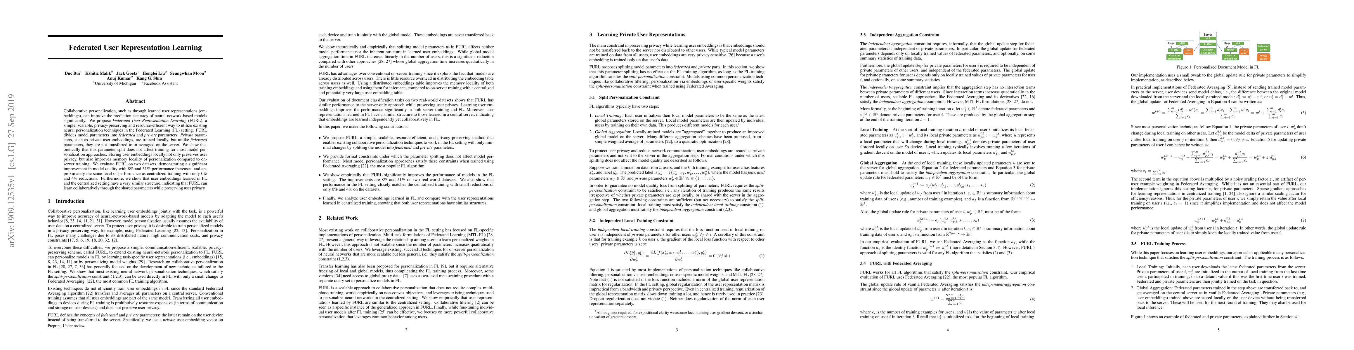 Federated User Representation Learning (FURL) proposes a method to enhance personalized predictions in Federated Learning by dividing model parameters into federated and private components. This approach preserves user privacy while achieving significant performance improvements and maintaining similar model quality to centralized training.