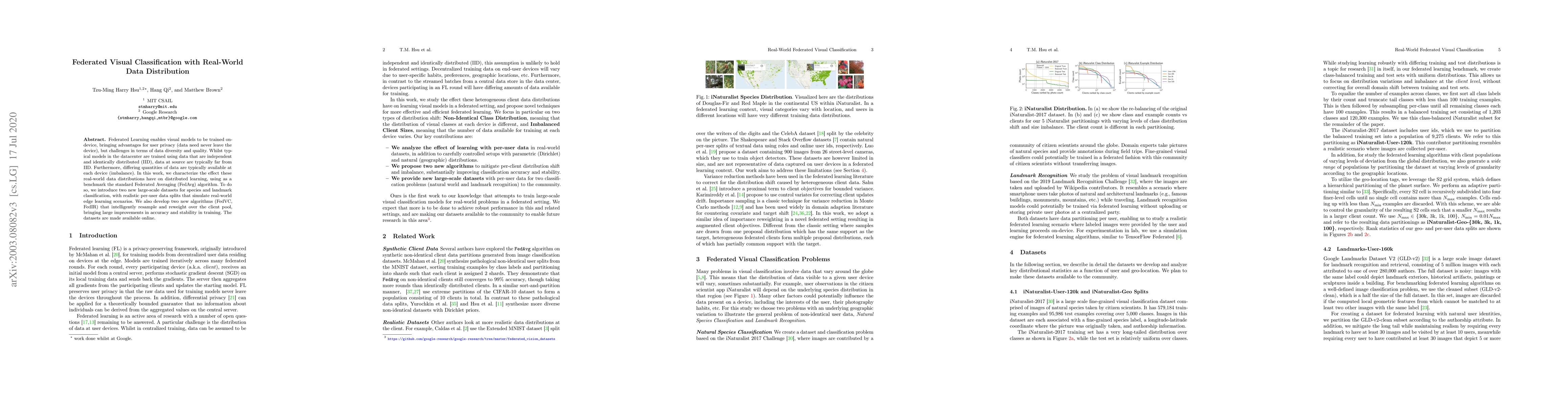 Federated Learning enables visual models to be trained on-device, bringing advantages for user privacy (data need never leave the device), but challenges in terms of data diversity and quality. Whilst typical models in the datacenter are trained using data that are independent and identically distributed (IID), data at source are typically far from IID. Furthermore, differing quantities of data are typically available at each device (imbalance). In this work, we characterize the effect these real-world data distributions have on distributed learning, using as a benchmark the standard Federated Averaging (FedAvg) algorithm. To do so, we introduce two new large-scale datasets for species and landmark classification, with realistic per-user data splits that simulate real-world edge learning scenarios. We also develop two new algorithms (FedVC, FedIR) that intelligently resample and reweight over the client pool, bringing large improvements in accuracy and stability in training. The datasets are made available online.