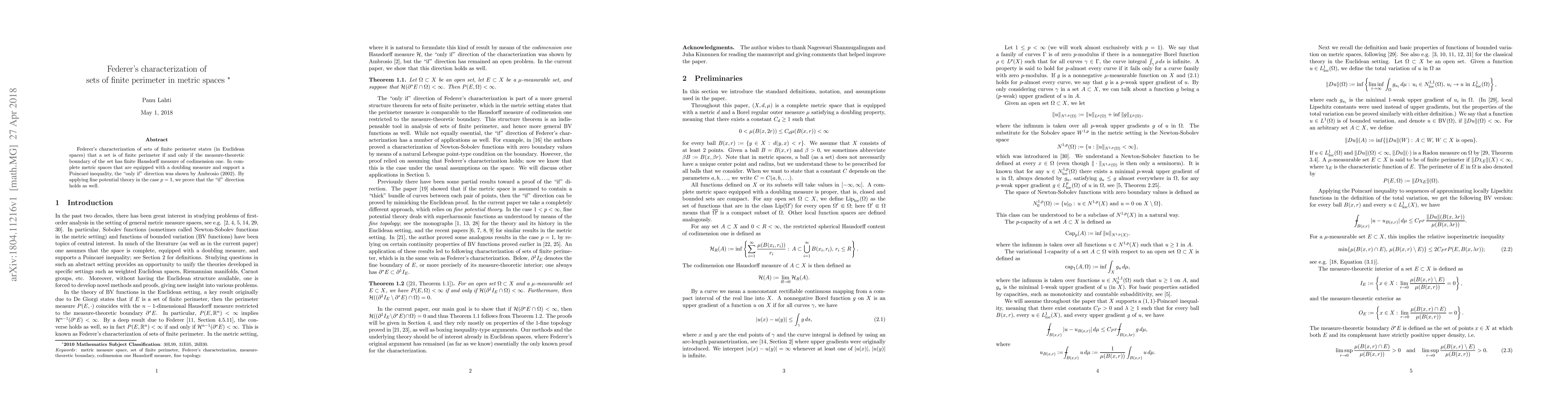 Summary: This paper proves Federer's characterization of sets of finite perimeter in complete metric spaces with a doubling measure and Poincaré inequality, confirming that a set has finite perimeter if its boundary has finite Hausdorff measure of codimension one. The result is established using fine potential theory for $p=1$.